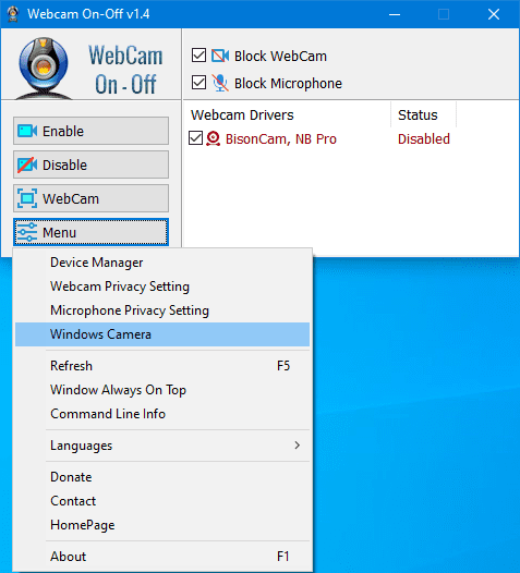 WebCam On-Off - небольшая бесплатная программа для быстрого включения и отключения веб-камеры на компьютере. Используется для собственной защиты, предотвращая доступ к веб-камере через внешнее подключение, и как дополнительный инструмент родительского контроля. В один клик отключает драйвер веб-камеры, а это значит, что злоумышленники не получают возможность использовать камеру.