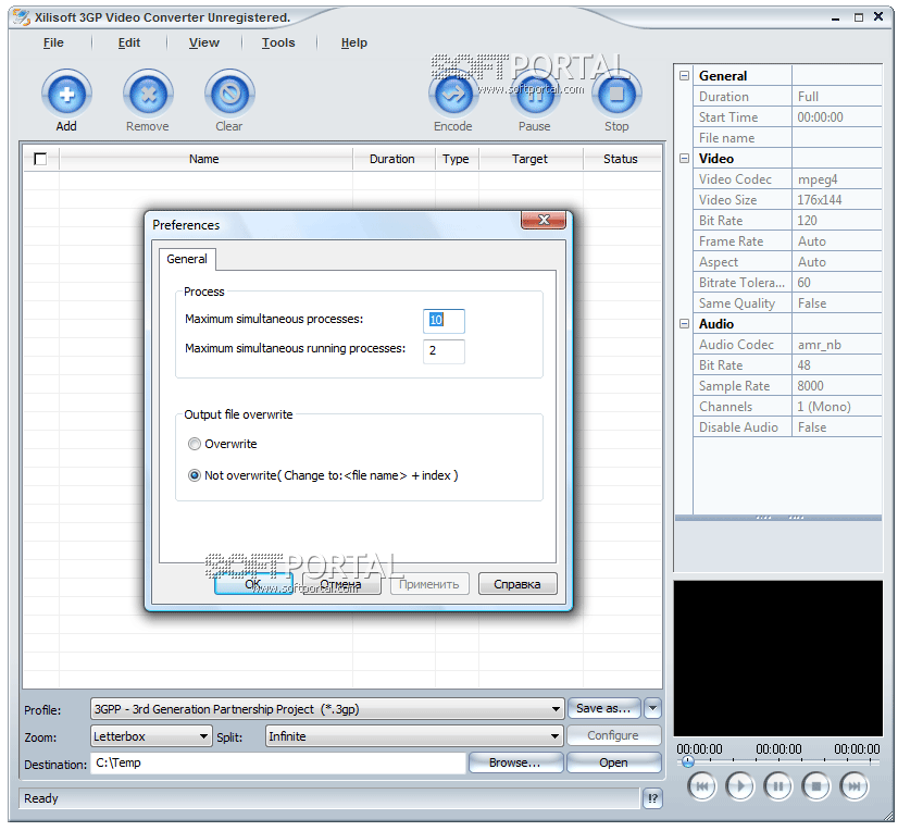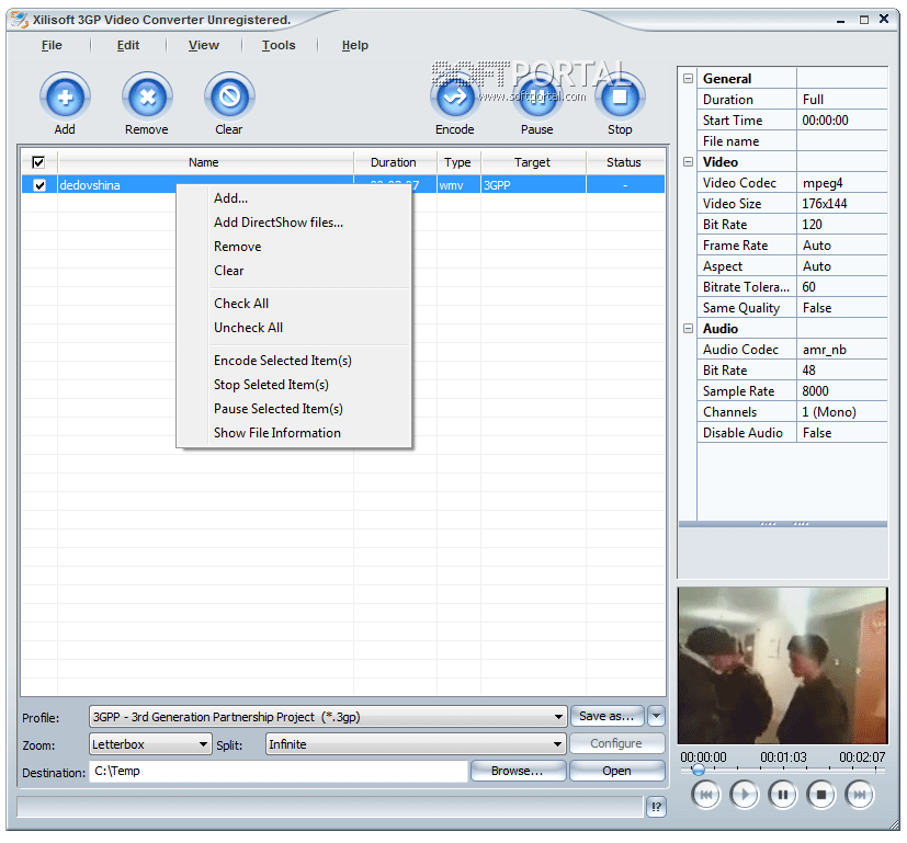 Xilisoft 3GP Video Converter - программа, с помощью которой вы можете легко перевести MPEG, VOB, AVI, DV, MOV, анимационный GIF, swf, MPEG4, RM, WMV, ASF, WAV, WMA, MP3, 3GP, m4a, mp4, h264, MP2, OGG, m4v в популярный и хорошо понимаемый смартфонами и мобильными телефонами формат - 3GP, и соотвественно в обратном направлении 3GP в AVI и MPEG.