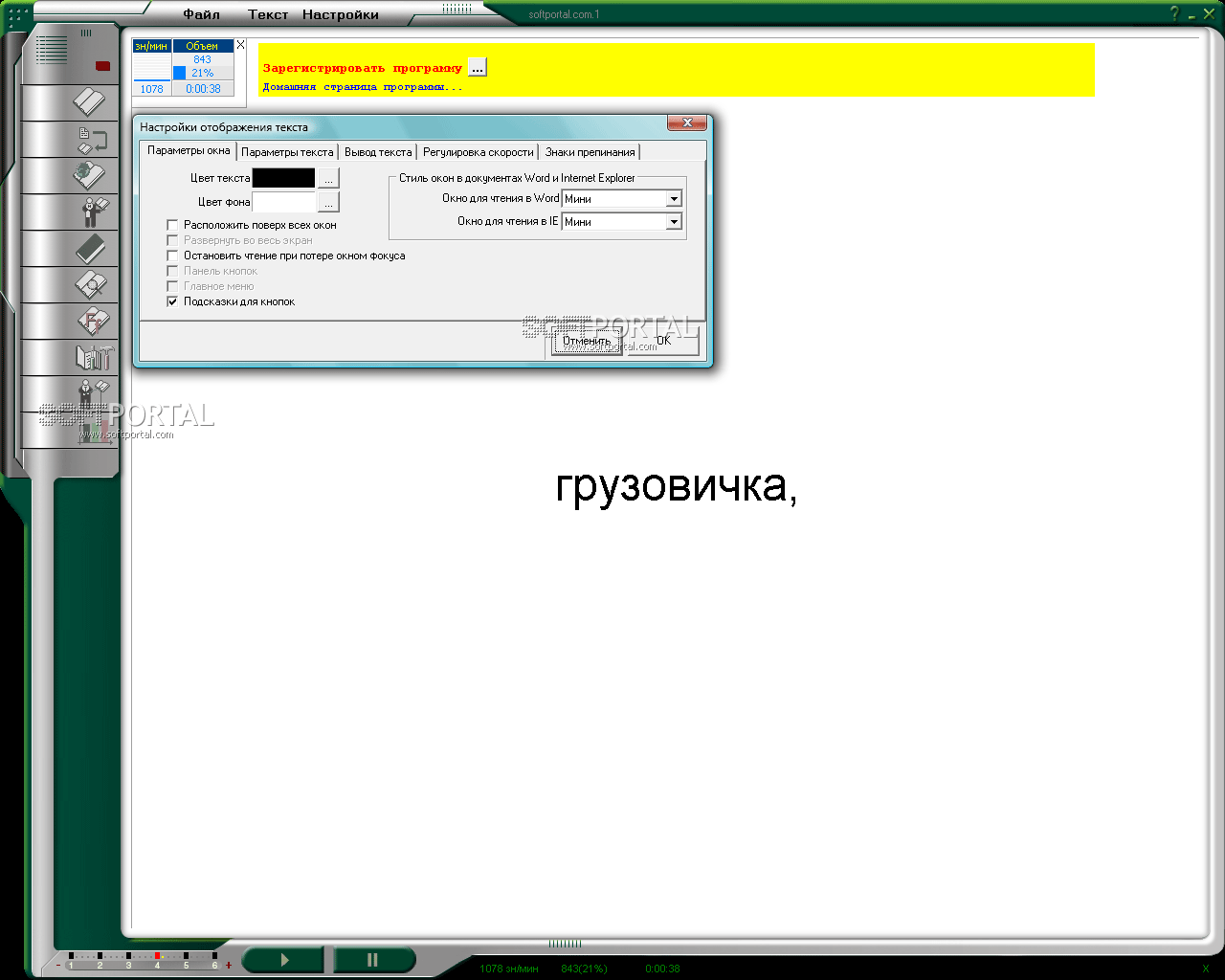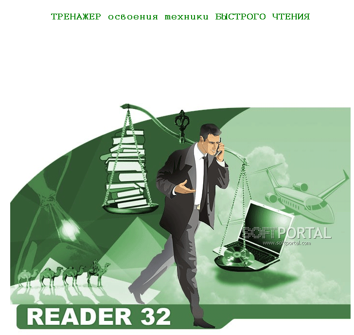 Скорочтение (Reader32) - Тренажер освоения техники быстрого чтения. Программа позволит научиться читать книги с огромной скоростью. Через некоторое время работы с программой Вы будете поглощать книги одну за другой в несколько раз быстрее! Существенное увеличение скорости чтения возможно за счет устранения процесса внутреннего проговаривания текста. Положительный эффект от программы Вы заметите уже после первого сеанса. Reader32 доступен всем, в том числе людям с ослабленным зрением. Reader32 настраивается индивидуально для каждого пользователя. Вы самостоятельно или с помощью “специального встроенного тренера” можете выбрать режимы обучения. Программа работает с текстовыми файлами TXT, DOC, RTF, HTML, буфером обмена.