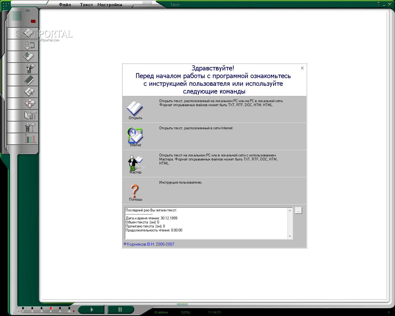 - Возможность чтения тестов больших объемов (в том числе из Интернет-библиотек, ссылки на которые встроены в программу)