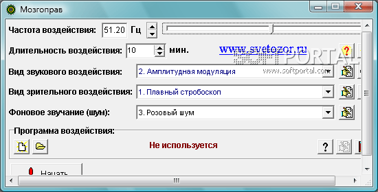 Мозгоправ - программа производит светозвуковую стимуляцию мозга с определенной частотой. Используя аудио и видеовозодействие, пытается вызвать резонансный отклик. Светозвуковая стимуляция мозга как метод одобрена Минздравом РФ (Пр.N4 от 26.11.97 УС МЗ РФ).