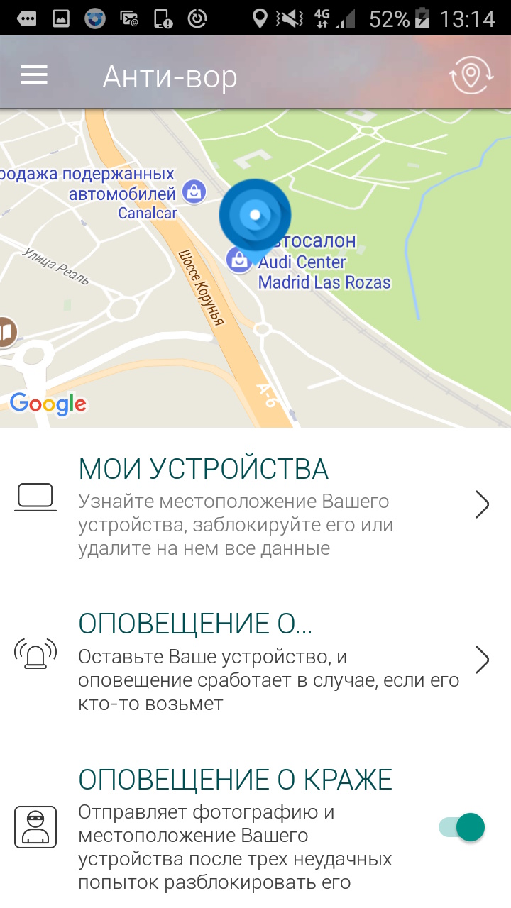 Кроме этого программа включает в себя функцию Анти-вор, благодаря чему пользователь может отслеживать местоположение утерянного или украденного мобильного устройства и в случае необходимости удаленно блокировать его или стереть конфиденциальные данные, чтобы предотвратить доступ к ценной информации.