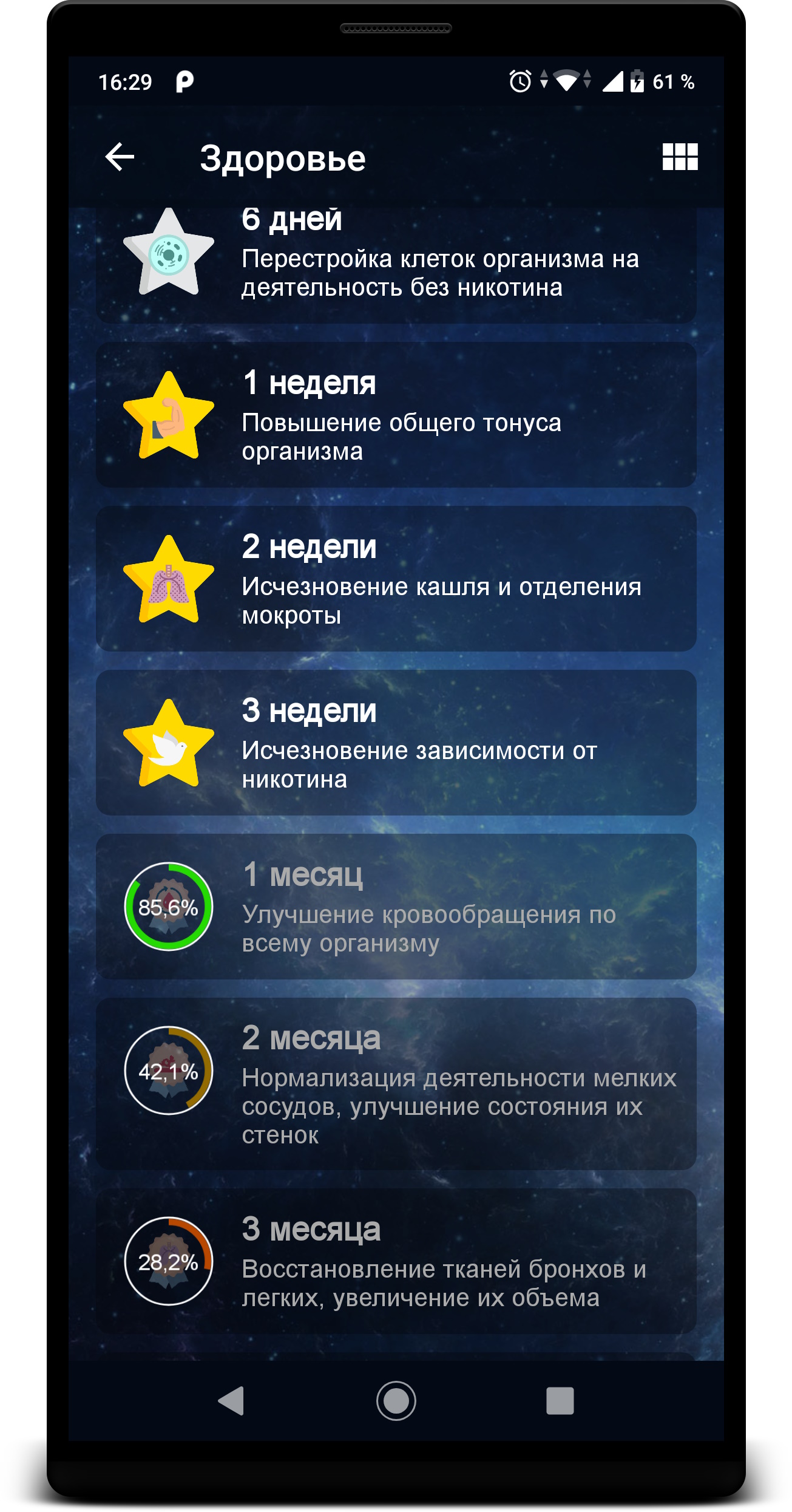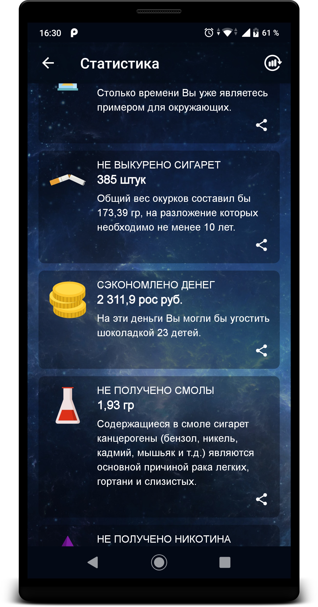 Программа позволяет просматривать статистическую информацию и пользе для организма за время отказа от сигарет, а также содержит полезные советы для тех, кто только собирается бросать и никак не решиться сделать первый шаг для полного отказа от этой вредной привычки.