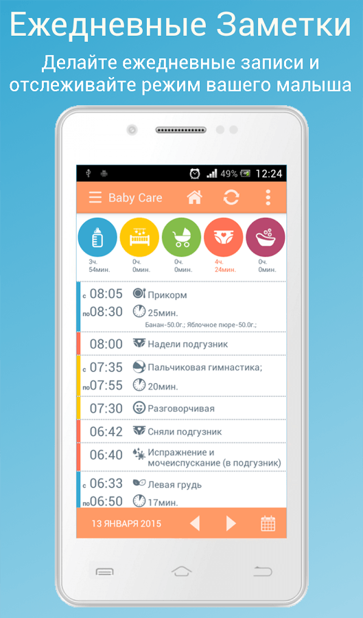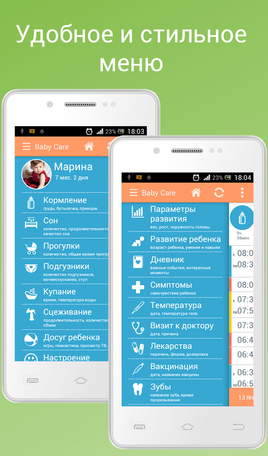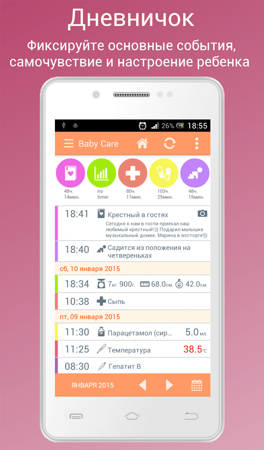Baby Care – удобный, простой в использовании и интуитивно понятный инструмент наблюдения за малышом, благодаря которому можно с легкостью сохранить такую важную для любого родителя информацию, как первая улыбка, первый зуб, первые шаги, первые слова и пр.