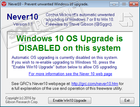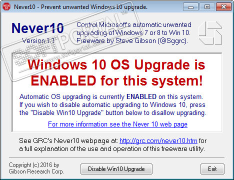 Never10 - крошечная портативная утилита для отключения автоматического обновления операционок Windows 7 и 8.x до "десятки". Если по каким-либо причинам вы все еще не доверяете новейшей ОС от Microsoft (не нравится дизайн, напуганы слухами о слежении, не тянет компьютер и т.д.) и не хотите принудительно апгрейдить свою операционку, то этот инструмент поможет вам решить этот вопрос буквально в один клик.