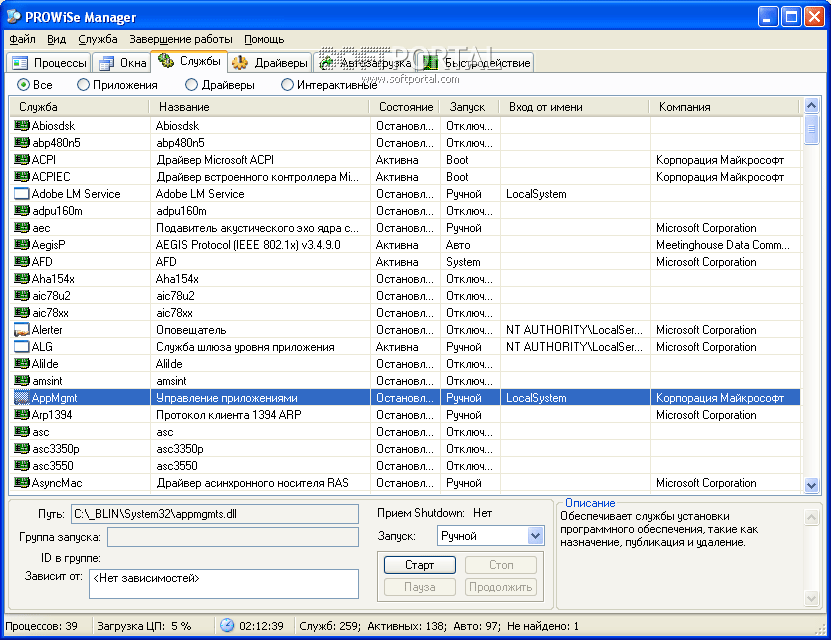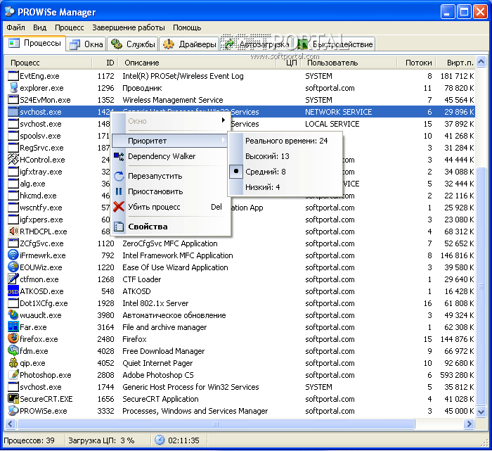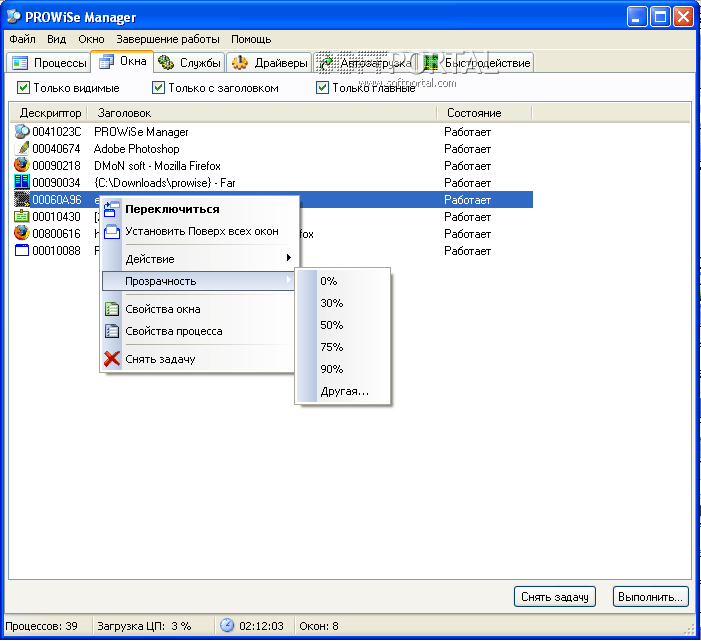 PROWiSe Manager - Утилита, показывающая подробную информацию о процессах и службах, запущенных на компьютере. Вы можете посмотреть список модулей, которые процесс загрузил и дескрипторы ресурсов системы, которые он открыл. Еще вы увидете статус запущенных программ, и сможете завершать программы, которые прекратили отвечать.