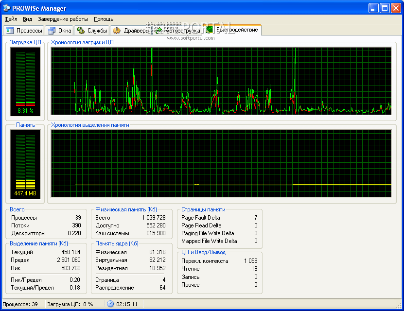 - Мониторинг быстродействия системы. Показывает общие показатели быстродействия системы подобно стандартному Диспетчеру Задач. Информация включает количество выделенной и доступной виртуальной и физической памяти, а также использование выгружаемой и невыгружаемой памяти ядра.