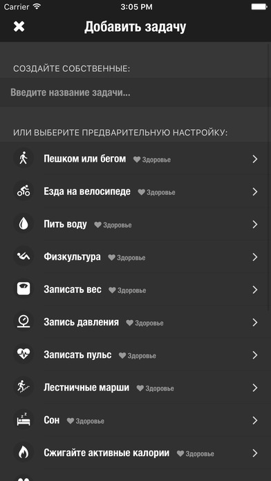 Позволяет добавить до шести ежедневных заданий от самых простых, например, "выпить стакан воды натощак", до требующих небольшого усилия - "выйти на пробежку". Ваша задача, создать полосу из нескольких последовательных дней выполненных заданий, а приложение поможет не сдаться в ответственный момент.
