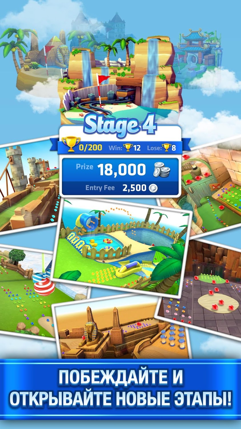 Выигрывайте и собирайте призы, чтобы открывать новые этапы. Находите и улучшайте клюшки, мячи и перчатки, подходящие вашему стилю игры. Возглавьте еженедельный рейтинг и примите участие в турнирах, чтобы заработать награды и славу. Покажите свое мастерство в испытании «Одним ударом». Также можно сыграть с друзьями из Facebook!