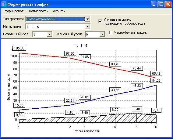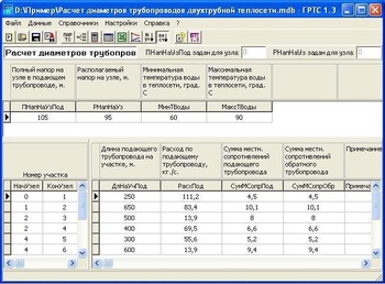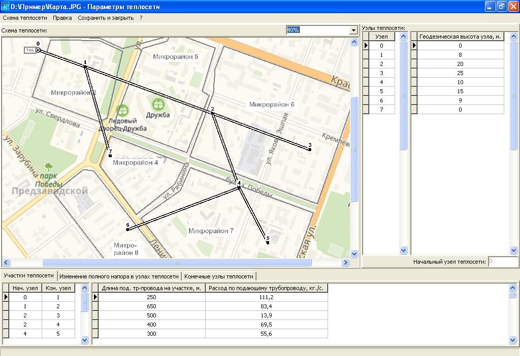 В программу необходимо ввести расходы воды и диаметры трубопроводов для каждого участка теплосети, напоры в произвольной точке теплосети. По введенным данным программа вычисляет напоры во всех точках теплосети.