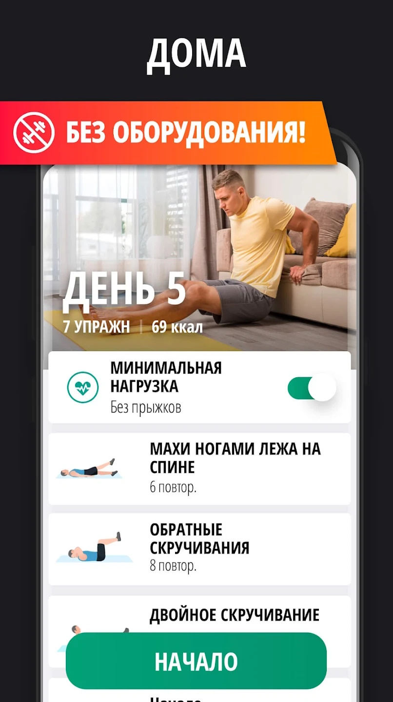 Вариант с малой ударной нагрузкой подойдет людям с избыточным весом или проблемами с суставами. Больше никакого зала и оборудования – веса вашего тела хватит, чтобы сжечь жир и накачать мышцы. Следите за сожженными калориями и сброшенным весом на графиках.