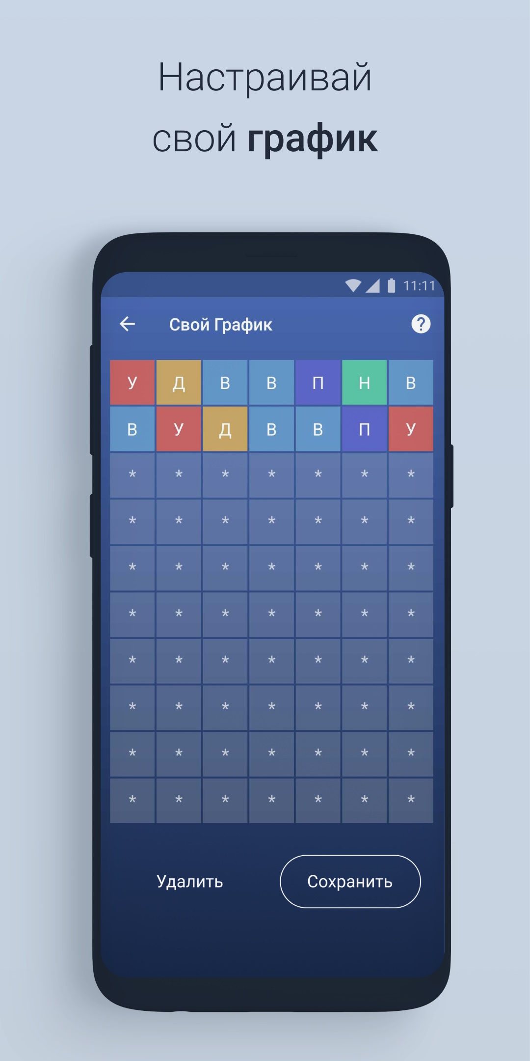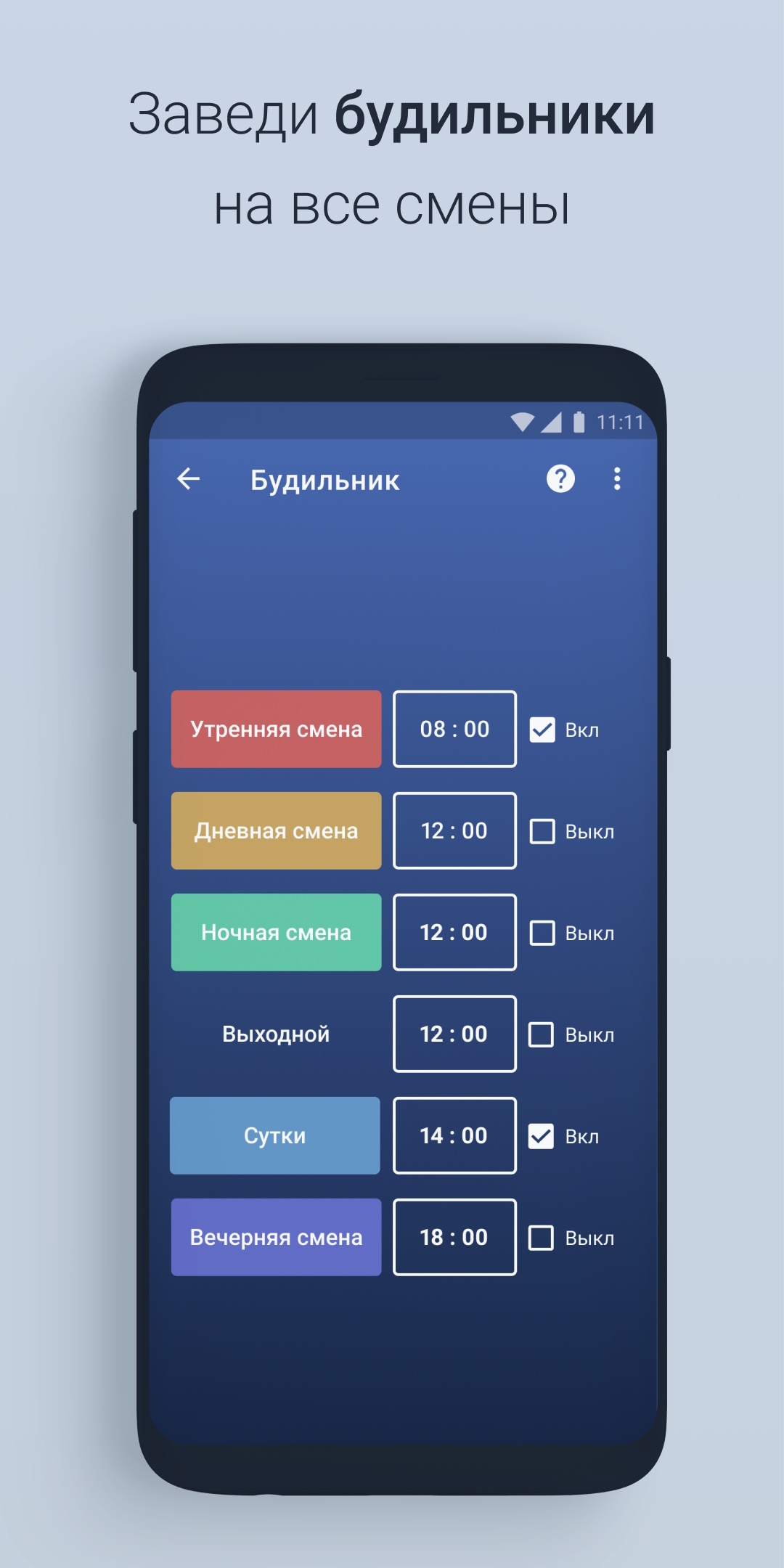 Достаточно просто выбрать готовый график из списка, или составить свой график смен, и нажать на нужную дату, с которой начать расчёт графика работы. Также приложение можно использовать как обычный календарь, или пользоваться цикличным будильником.