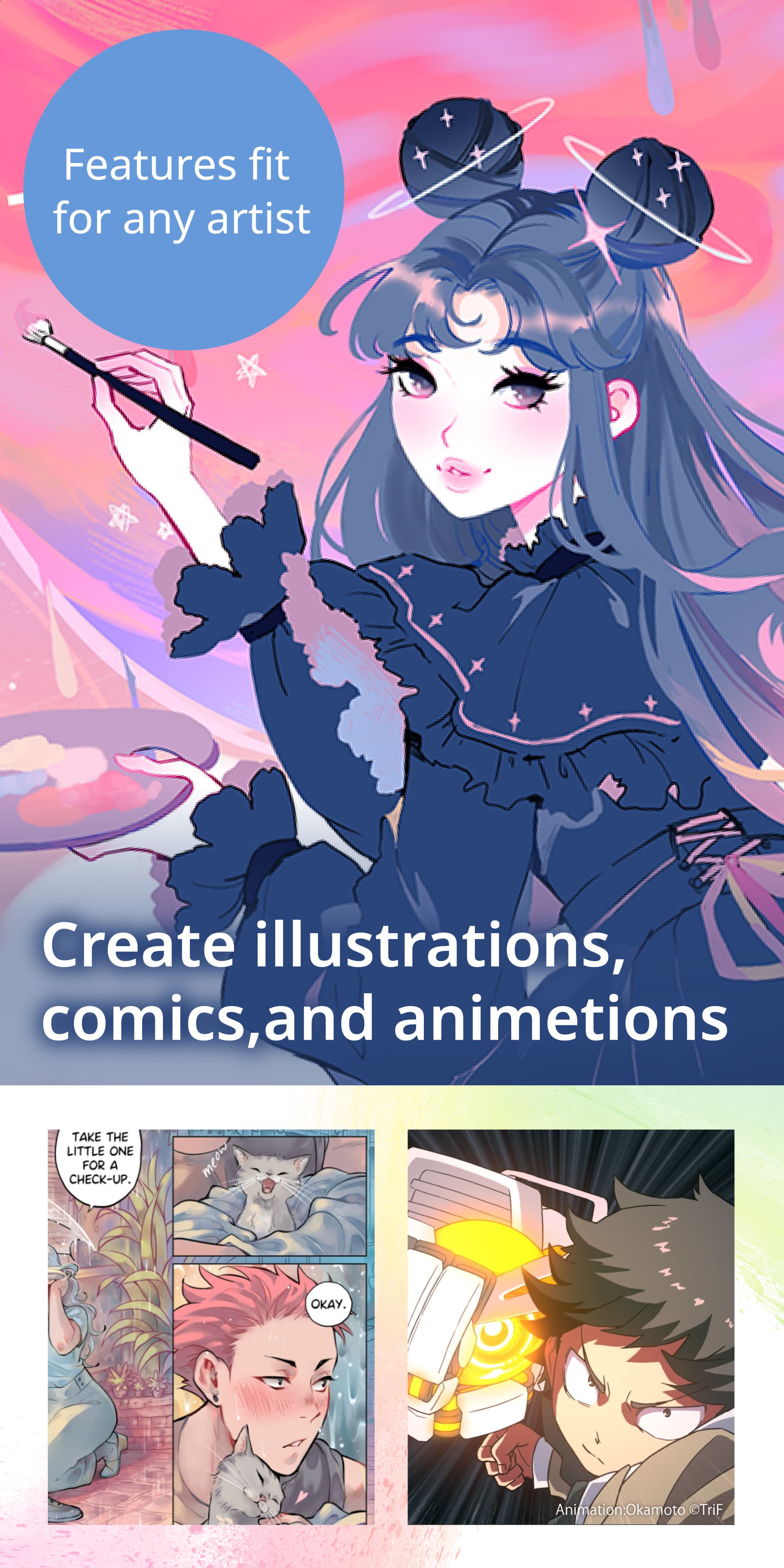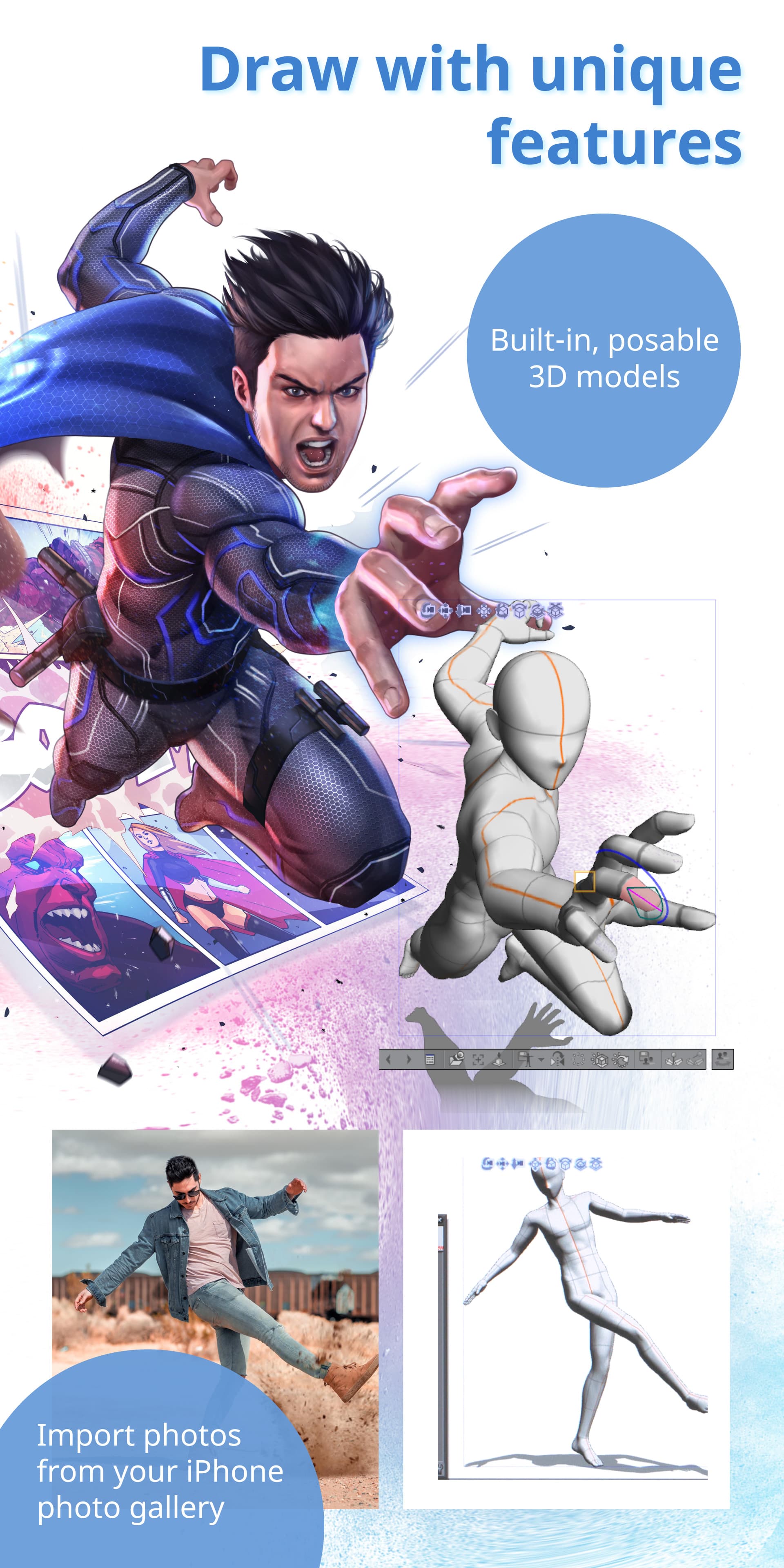 Clip Studio Paint оснащен функциями, которые помогут начинающим нарисовать, например, 3D-рисунок, или легко набросать натуральные фигуры. Кроме этого присутствует более 60 000 кистей и текстур на официальном сайте Clip Studio Paint. Пользователям доступно множество удобных материалов, которые помогут вам быстро визуализировать вещи, требующие много времени для ручной прорисовки, и создавать художественные работы самых разных стилей.