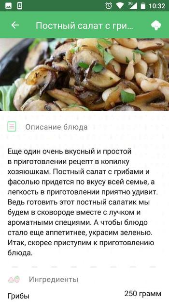 Вегетарианские блюда - бесплатное приложение, предлагает сборник вегетарианских рецептов, благодаря которому можно с легкостью составить вкусное и полезное меню на целый день. Здесь присутствуют и рецепты блюд из овощей, круп, бобовых и других продуктов, праздничных блюд, для завтрака, обеда или ужина (гаспачо, борщ, салаты, голубцы, каши, халва, закуски и многое другое).