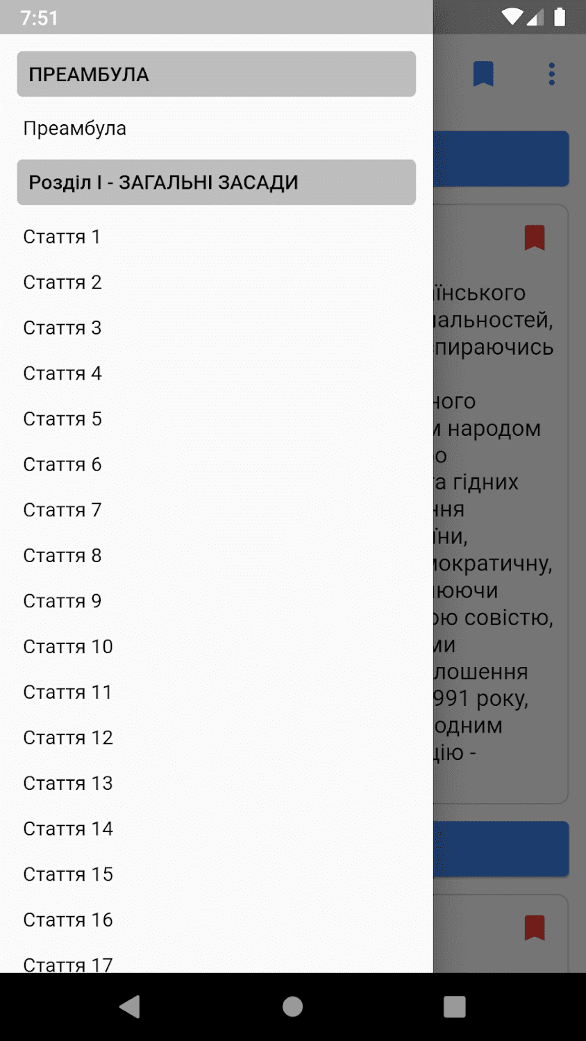 - Скрытая панель с содержанием Конституции Украины для удобной навигации по разделам и статьям.