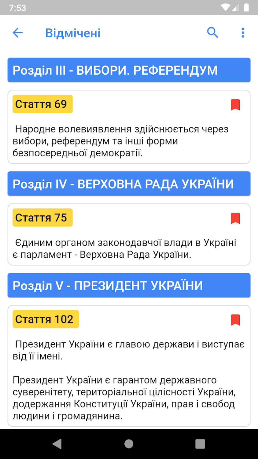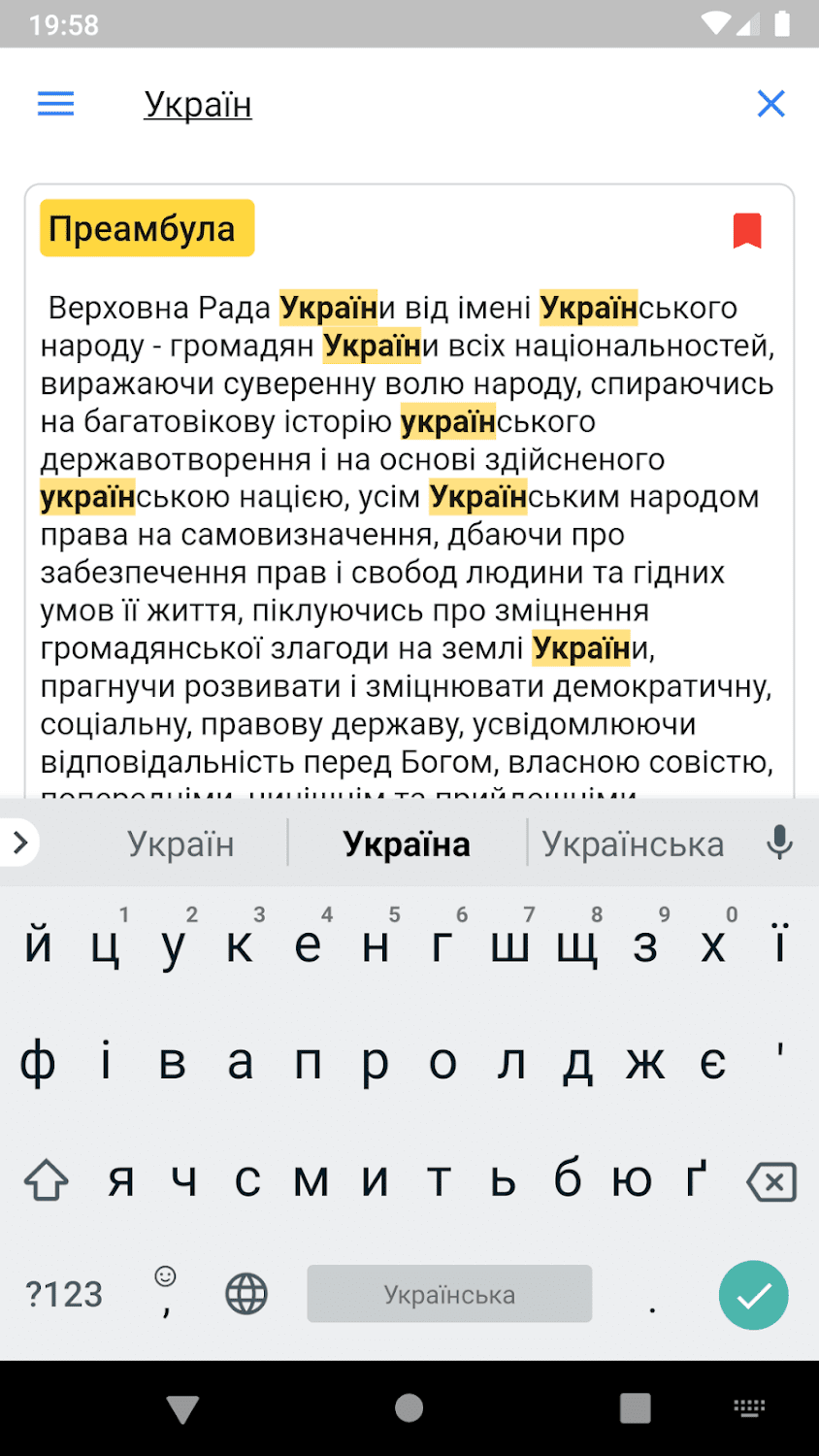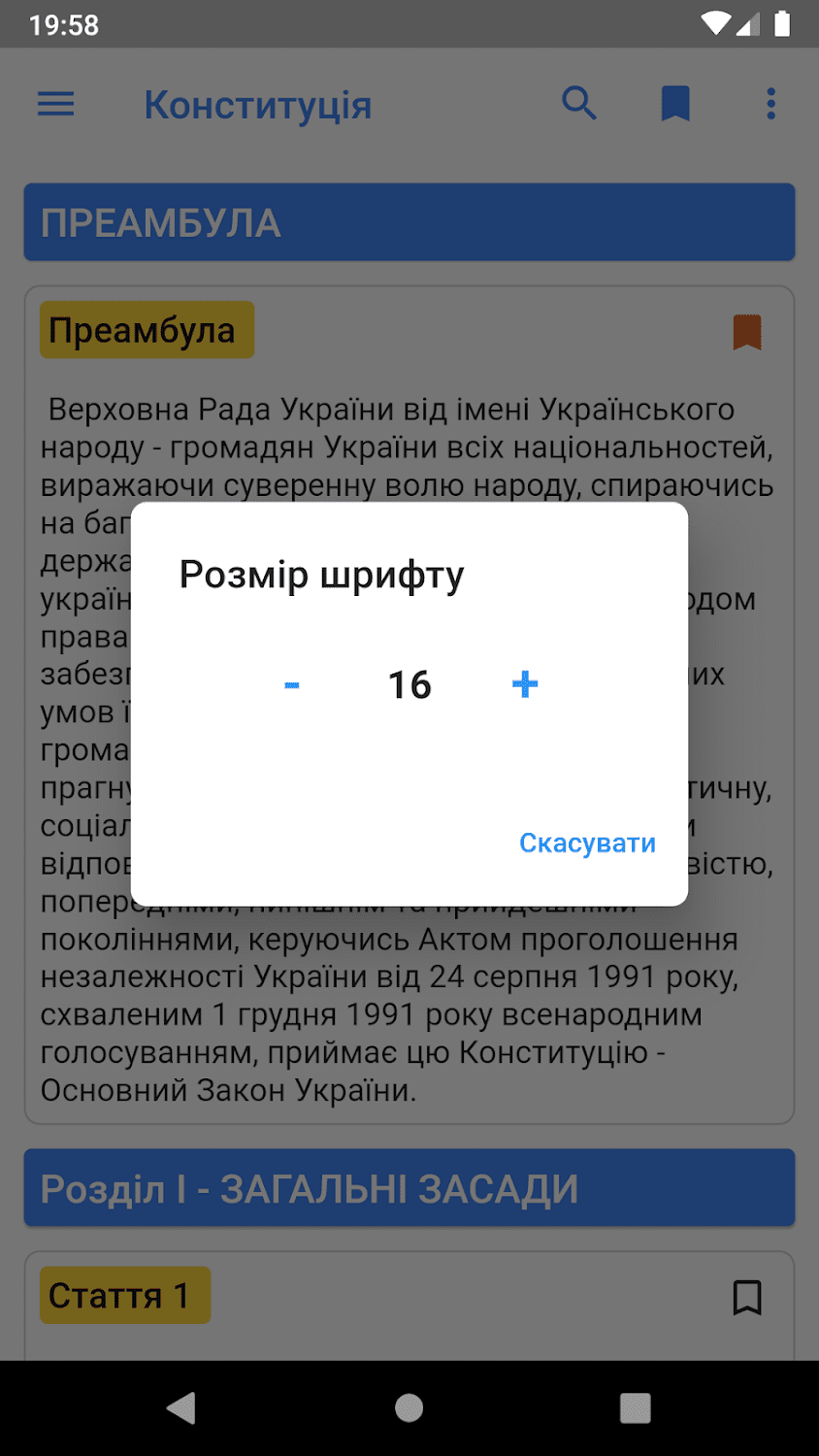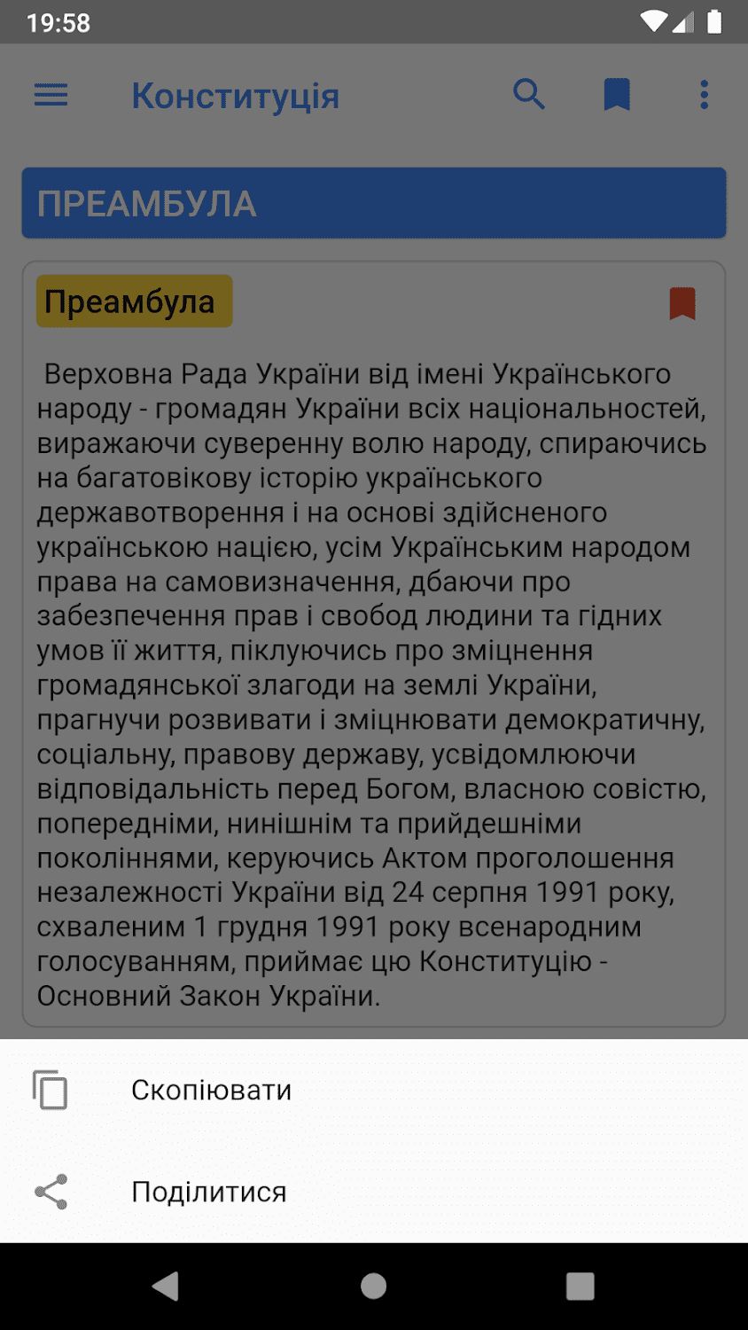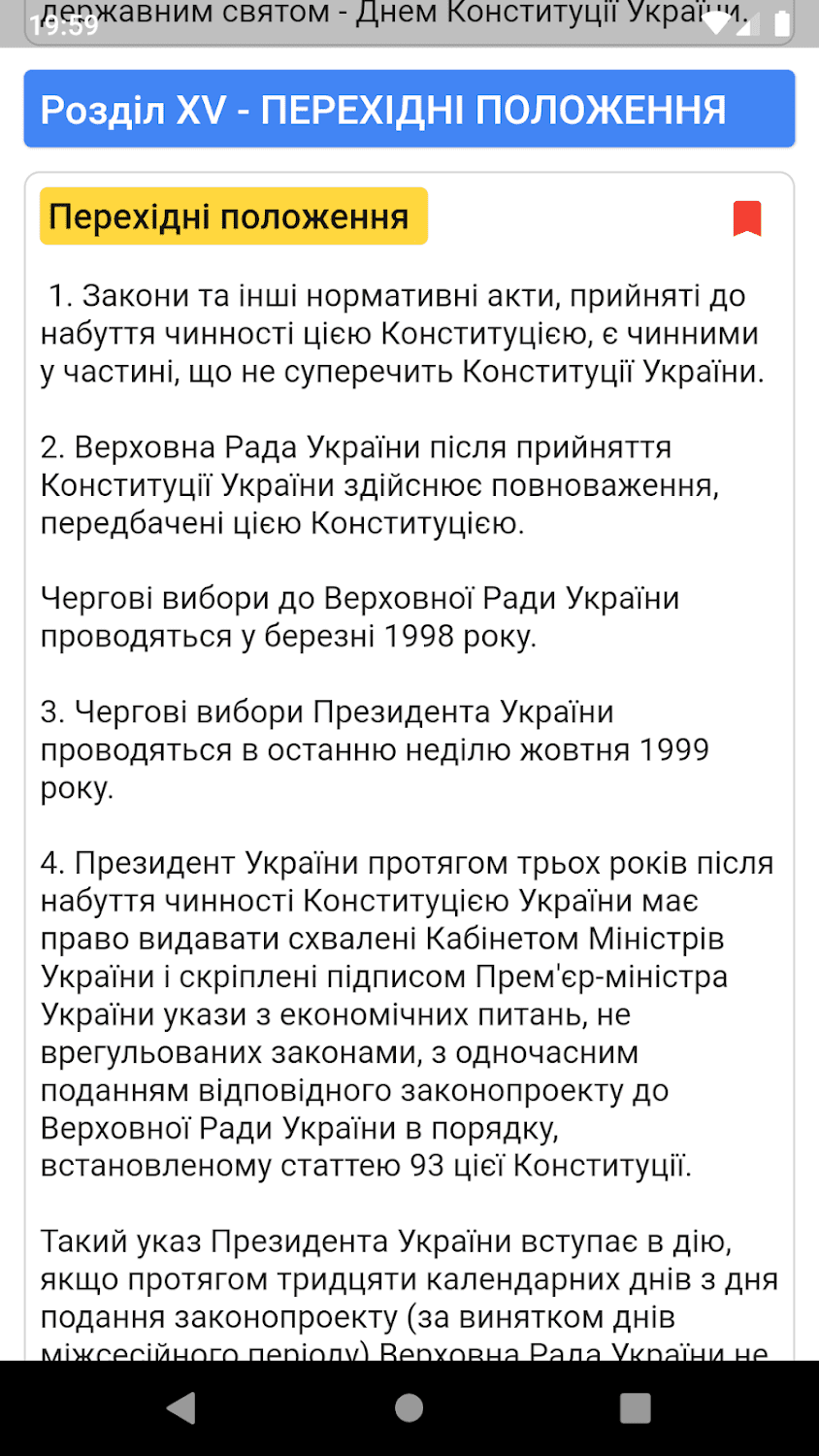 Конституция Украины - приложение, которое представляет собой действующую Конституцию Украины с редакцией от 01.01.2020 года. Состоит из 15 разделов. 161 статья собрана в 14 разделов, а XV раздел содержит 16 переходных положений. Тексту Конституции предшествует Преамбула.