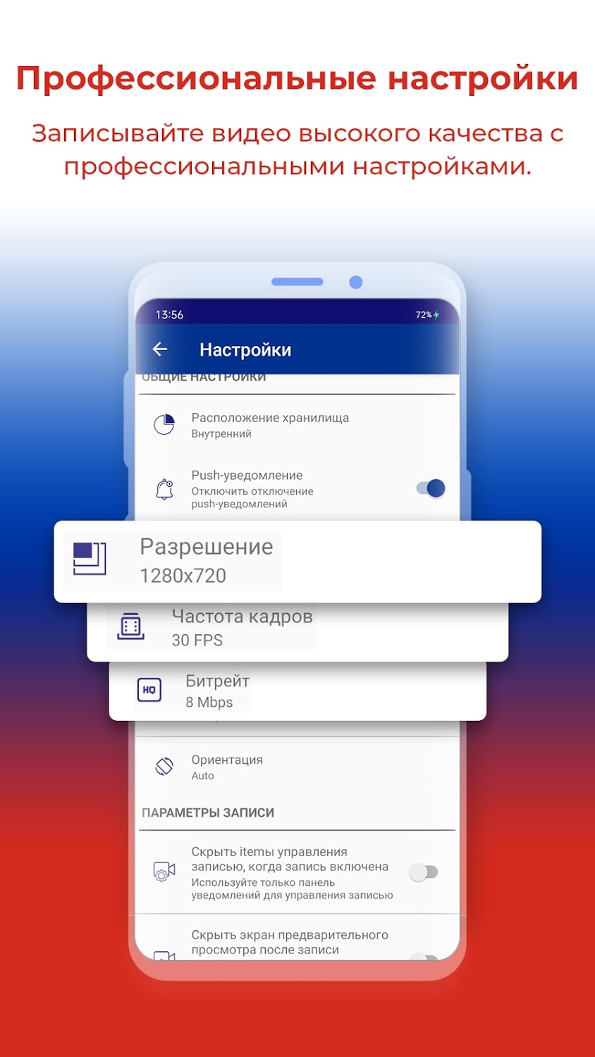 - Выбор качества разрешения, частоты кадров, скорости передачи данных, ориентации экрана, активации аудиозаписи и пр.