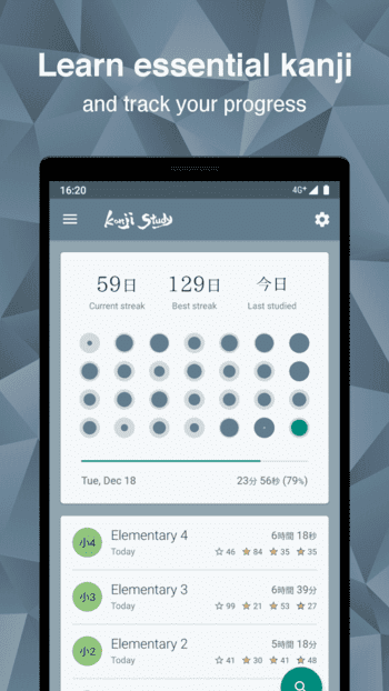 Японский Kanji Study - простой и полезный инструмент для изучения японских иероглифов с помощью карточек, настраиваемых тестов и заданий на проверку начертаний. По каждому иероглифу есть подробная информация с множеством примеров.