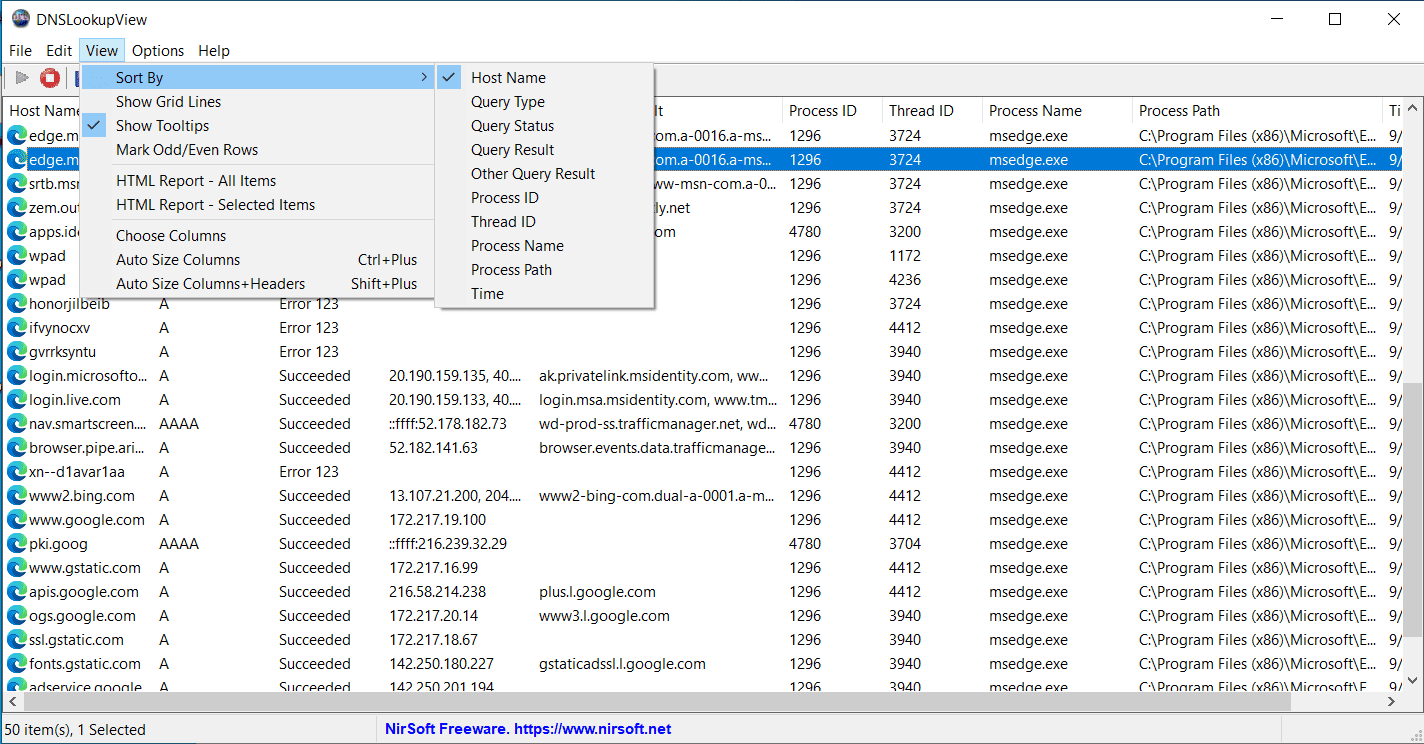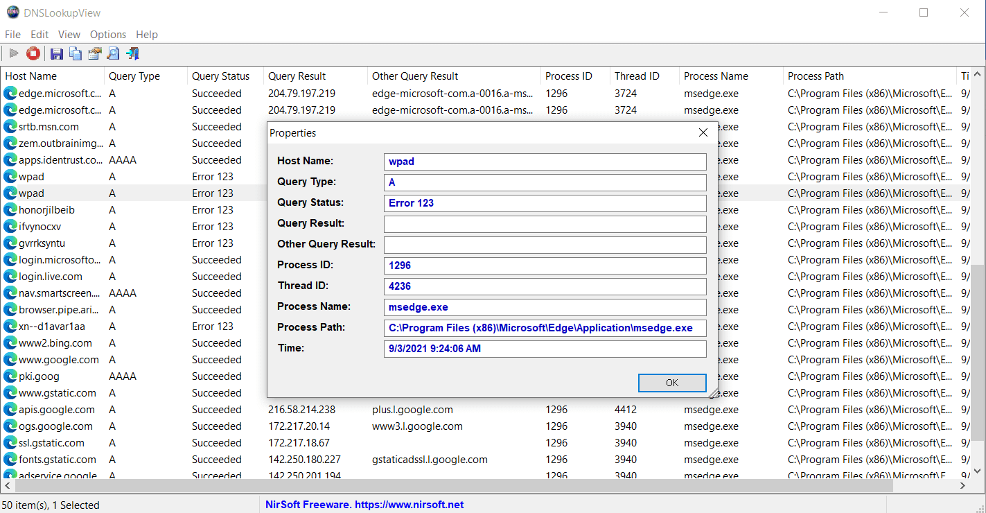 DNSLookupView - бесплатный инструмент трассировки DNS для Windows 10, который позволяет просматривать детали каждого DNS-запроса, отправленного через службу DNS Client в операционной системе Windows.