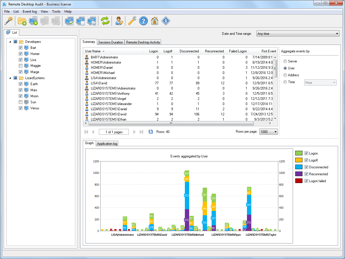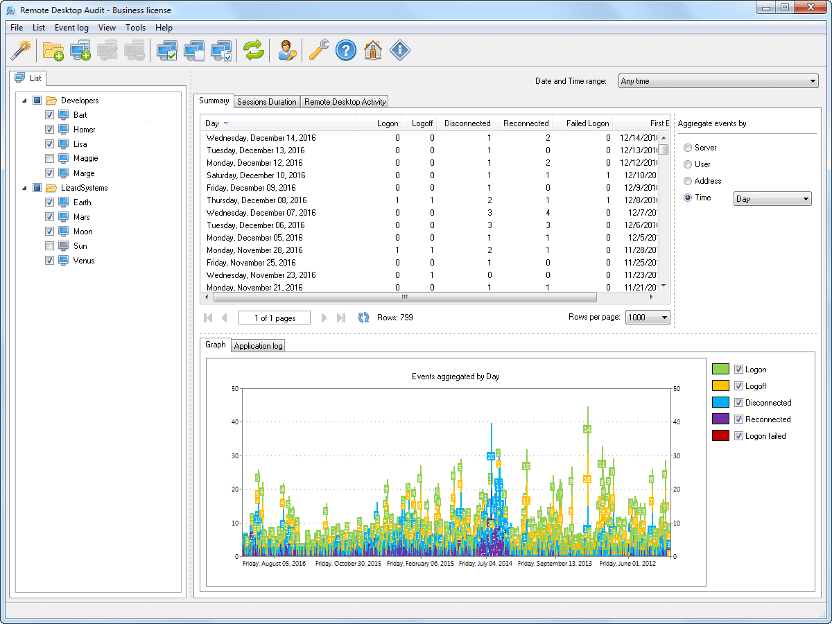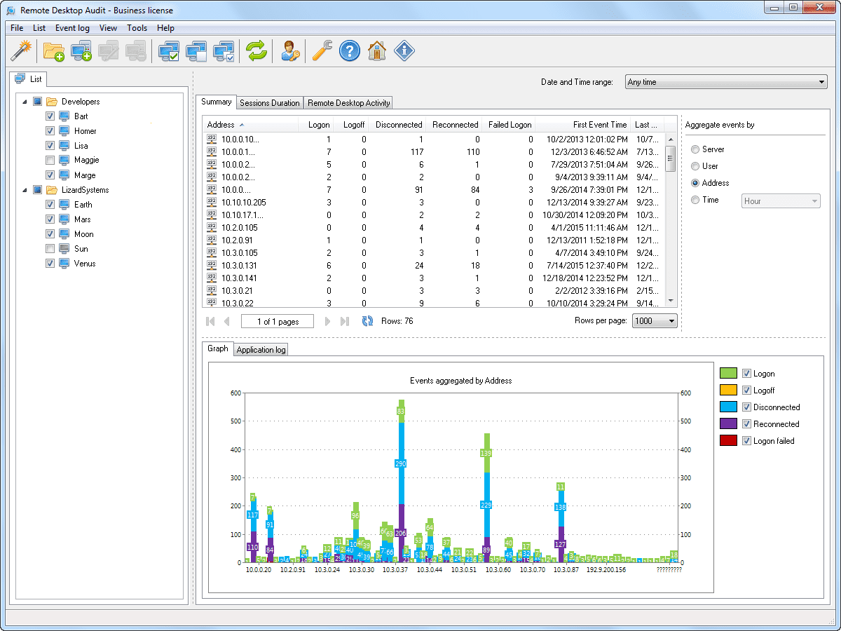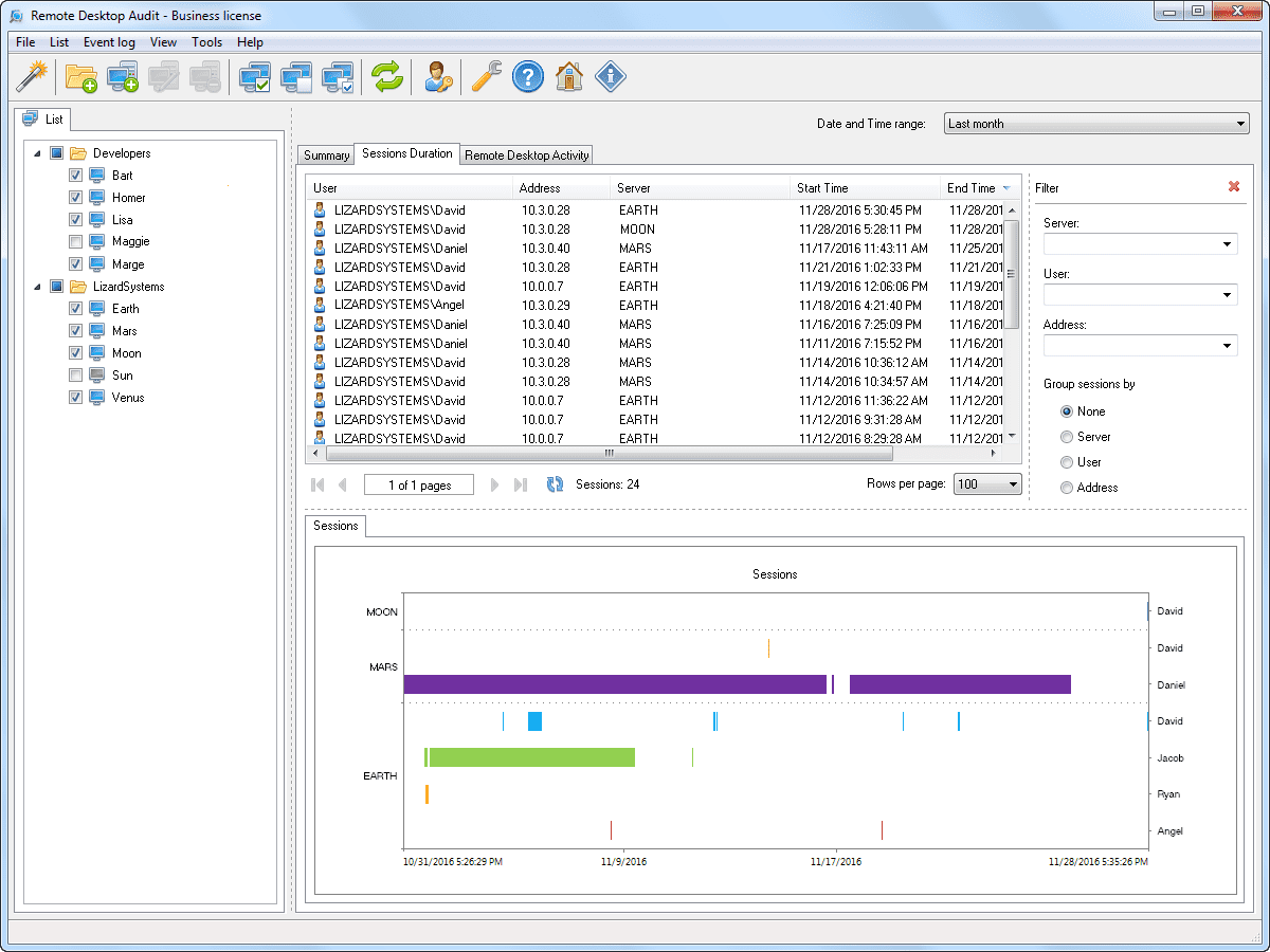 Remote Desktop Audit - приложение для мониторинга активности пользователей, которые получают доступ к вашим серверам через удаленный рабочий стол. Вся информация о сеансах удаленного рабочего стола на ваших серверах будет собрана в одном месте, что позволит провести углубленный анализ данных. Благодаря фильтрации и агрегации данных вы сможете повысить планку отчетов о данных и просматривать их как в табличном, так и в графическом представлении.
