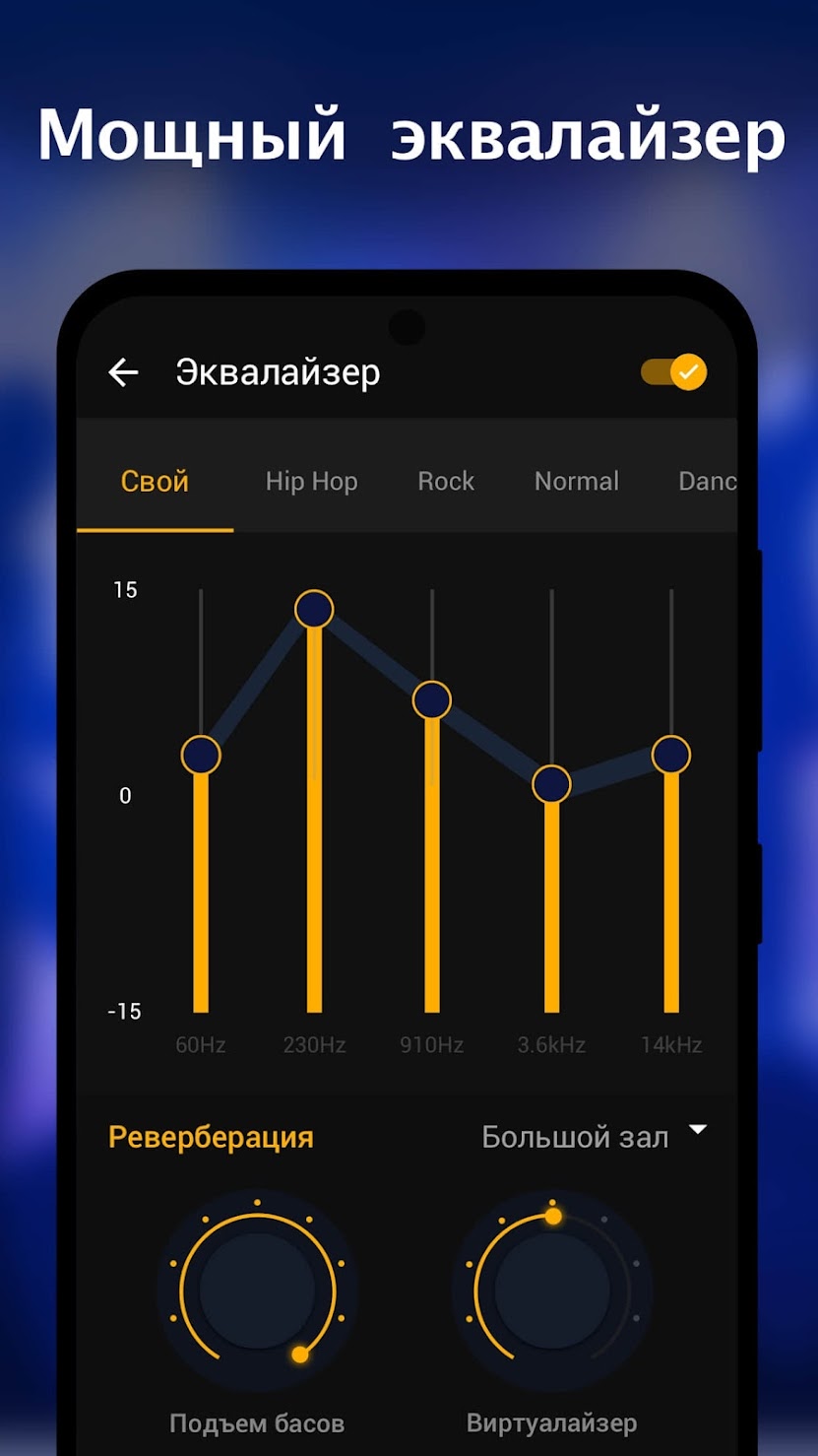 - Мощный эквалайзер с усилением басов, эффектом эха и т. д.