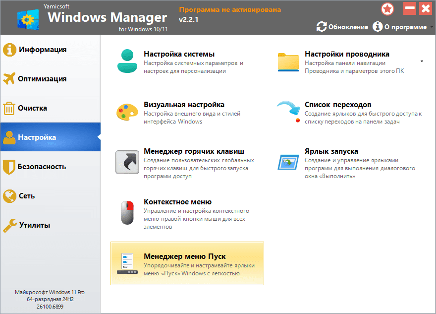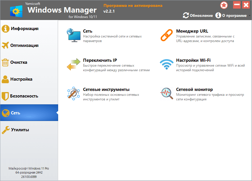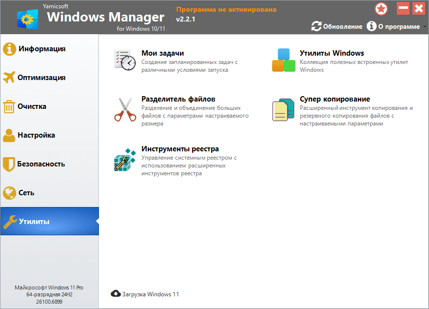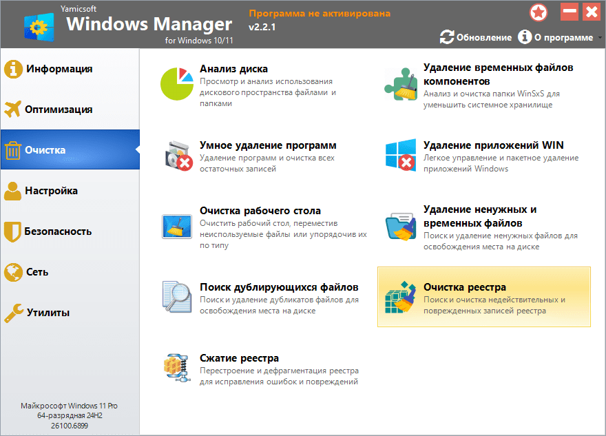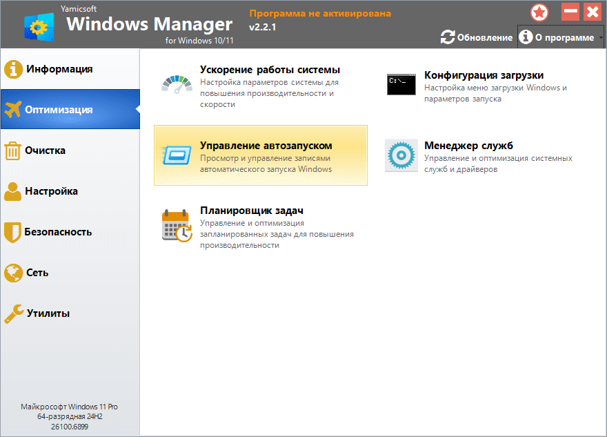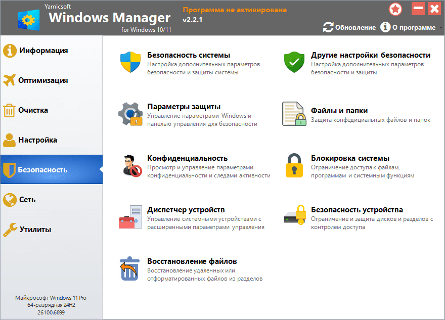 Все инструменты Windows Manager разбиты на несколько категорий: Информация, Оптимизация, Очистка, Настройка, Безопасность, Сеть и Разные утилиты