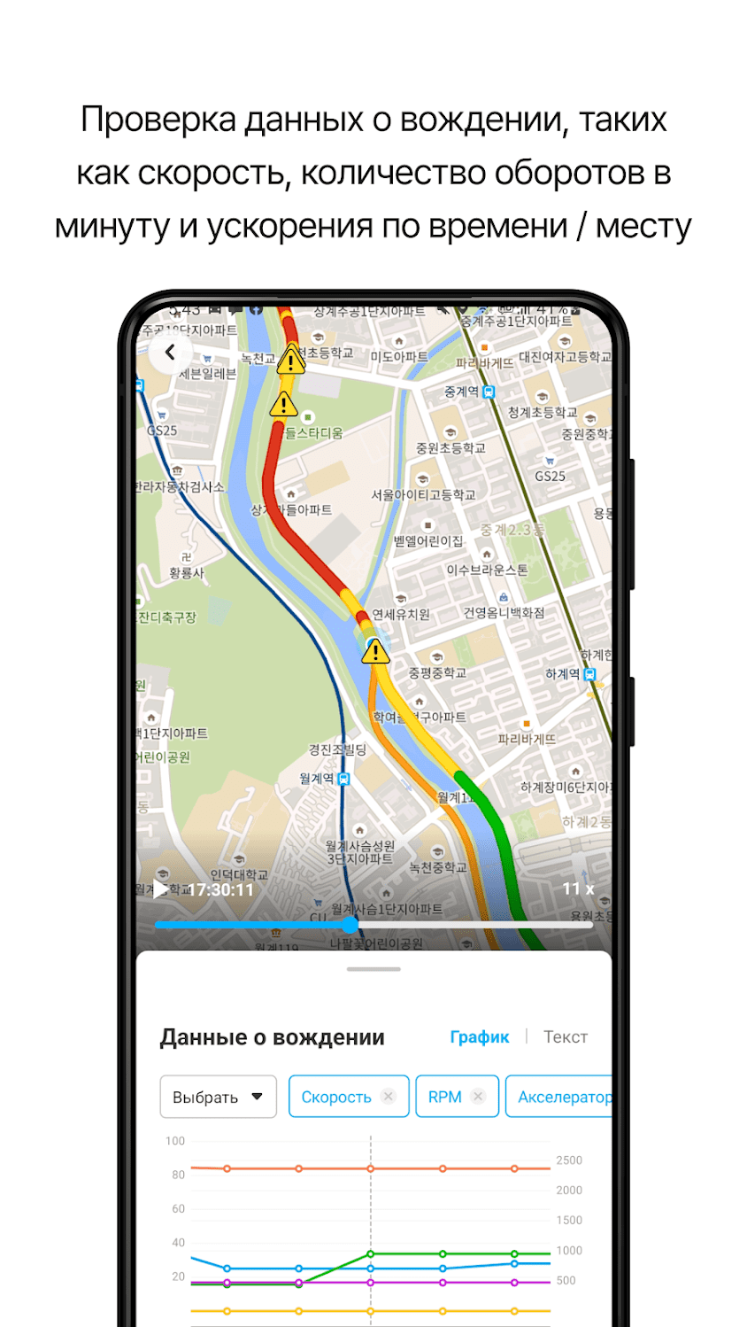 - Проверка данных о вождении, таких как скорость, количество оборотов в минуту и ускорение по времени/месту с помощью функции воспроизведения вождения.