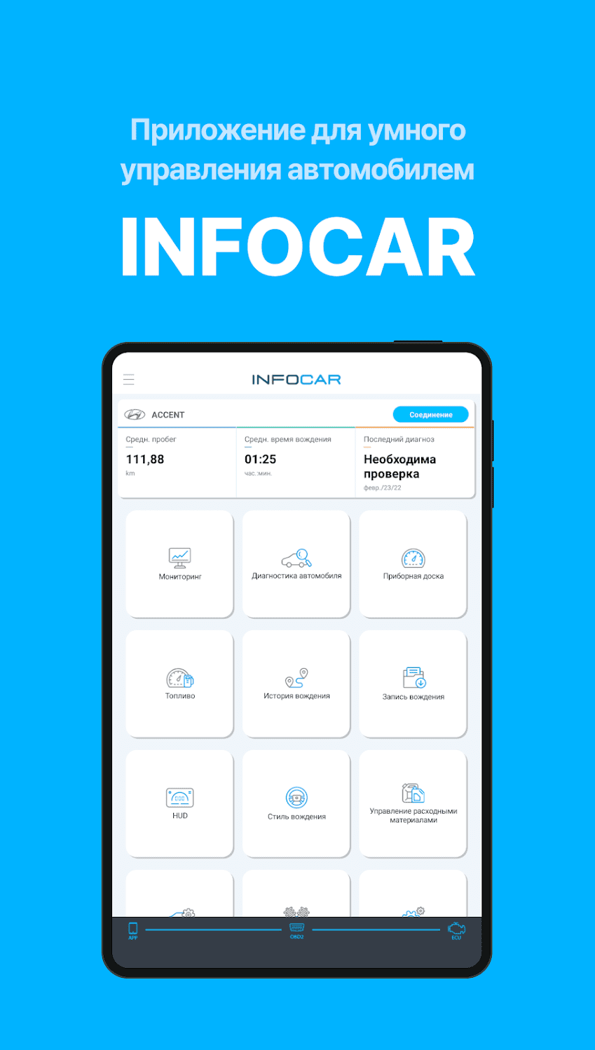 Infocar - мобильный диагностический сканер OBD ELM. Присутствует возможность проверки наличия неисправности в автомобиле, регистрируются пробег, время, средняя скорость, экономия топлива и т.д. по каждой поездке, настраиваемая информационная панель в режиме реального времени, планирование затрат с помощью баланса и цикла замены расходных материалов и пр.