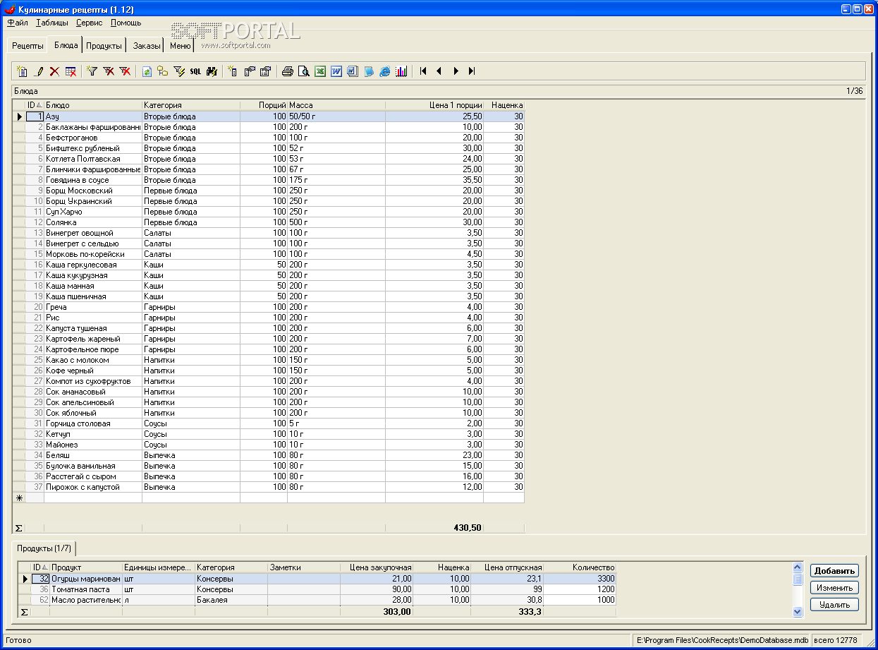 Вы можете автоматизировать процесс составления калькуляционных карт, меню, блюд и движения продуктов на складе. По всем полям таблиц можно удобно сортировать (включая множественную сортировку по нескольким полям, удерживая Shift), фильтровать, группировать и искать записи. Помимо уже имеющихся таблиц можно создавать собственные "под ключ". Имеется возможность создавать новые поля не только с хранимой, но и вычисляемой по формулам типа SELECT информацией, а также создавать поля типа "картинка". Программа позволяет строить дерево данных по заданным полям, считать итоги по заданным формулам, задавать правила цветовыделения строк, определять ниспадающие списки и значения в них, определять подчиненные таблицы с типом связи "один-ко-многим" или "многие-ко-многим". Любую таблицу можно распечатать, экспортировать в MS Excel, MS Word или текстовый формат CSV. Имеется импорт из других источников данных. И многие другие удобства.