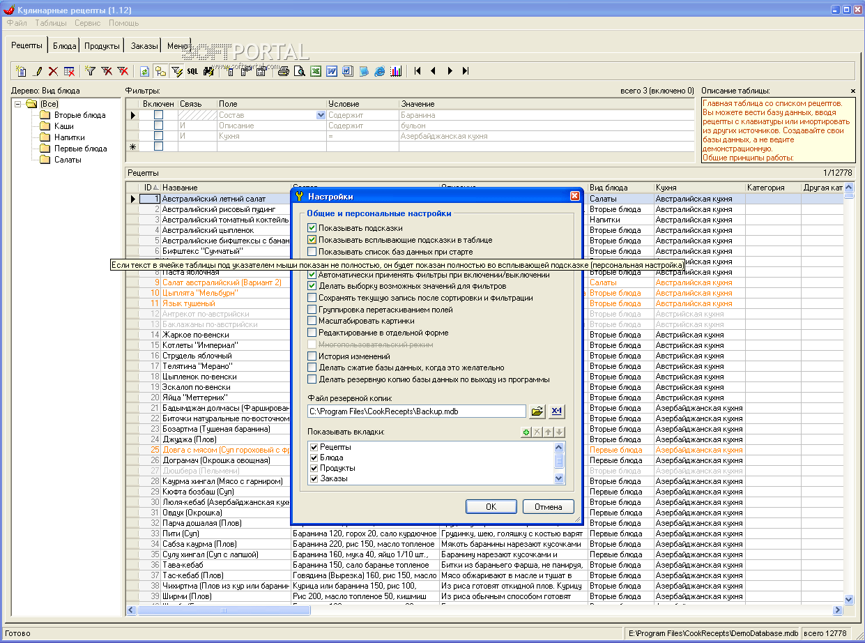 Кулинарные рецепты - программа предназначена для ведения базы данных кулинарных рецептов, учета продуктов, составления и калькуляции блюд, расчета цен и других целей. Программа содержит более 12000 рецептов и описания приготовления блюд из любых продуктов.