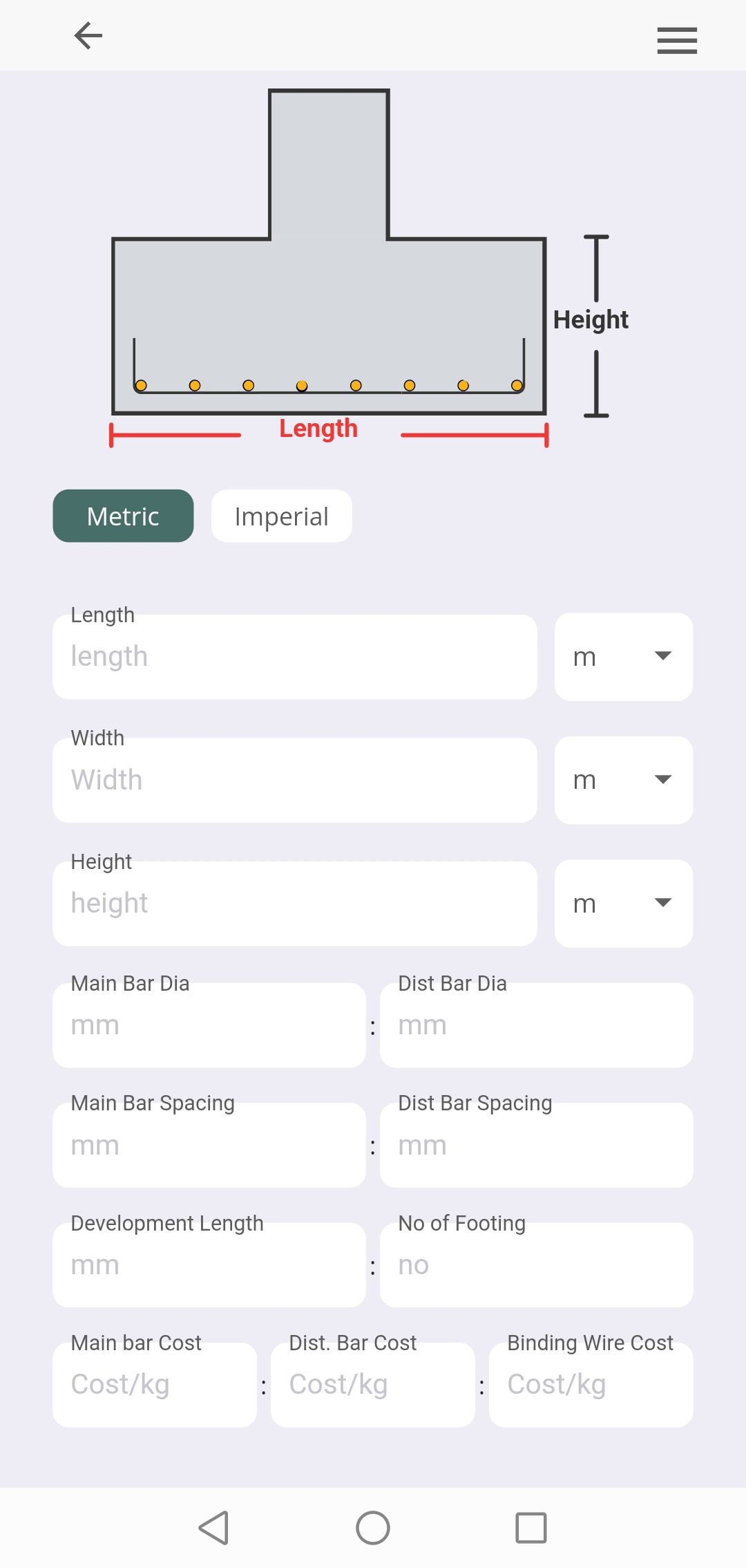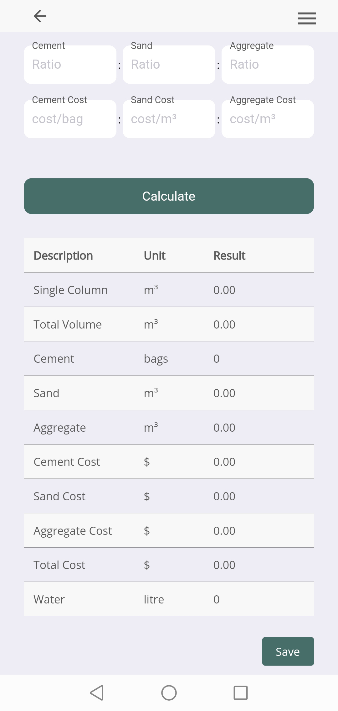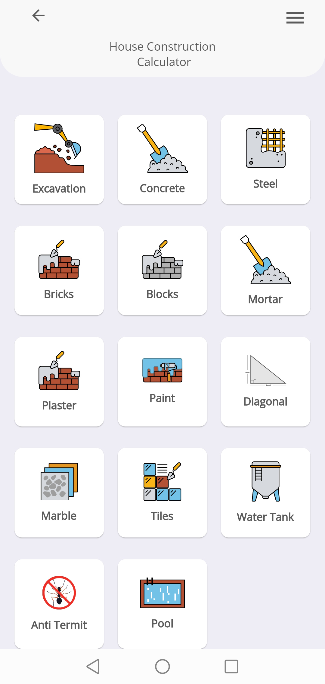 Каждая категория снабжена собственными калькуляторами, что облегчает пользователям быстрый расчет конкретных величин для своих проектов. Например, категория Калькулятор строительства дома включает ряд калькуляторов для выемки грунта, бетона, стали, кирпича, блоков, напольных покрытий, раствора, штукатурки, краски, мрамора, плитки, резервуара для воды, антитермита и плавательного бассейна.