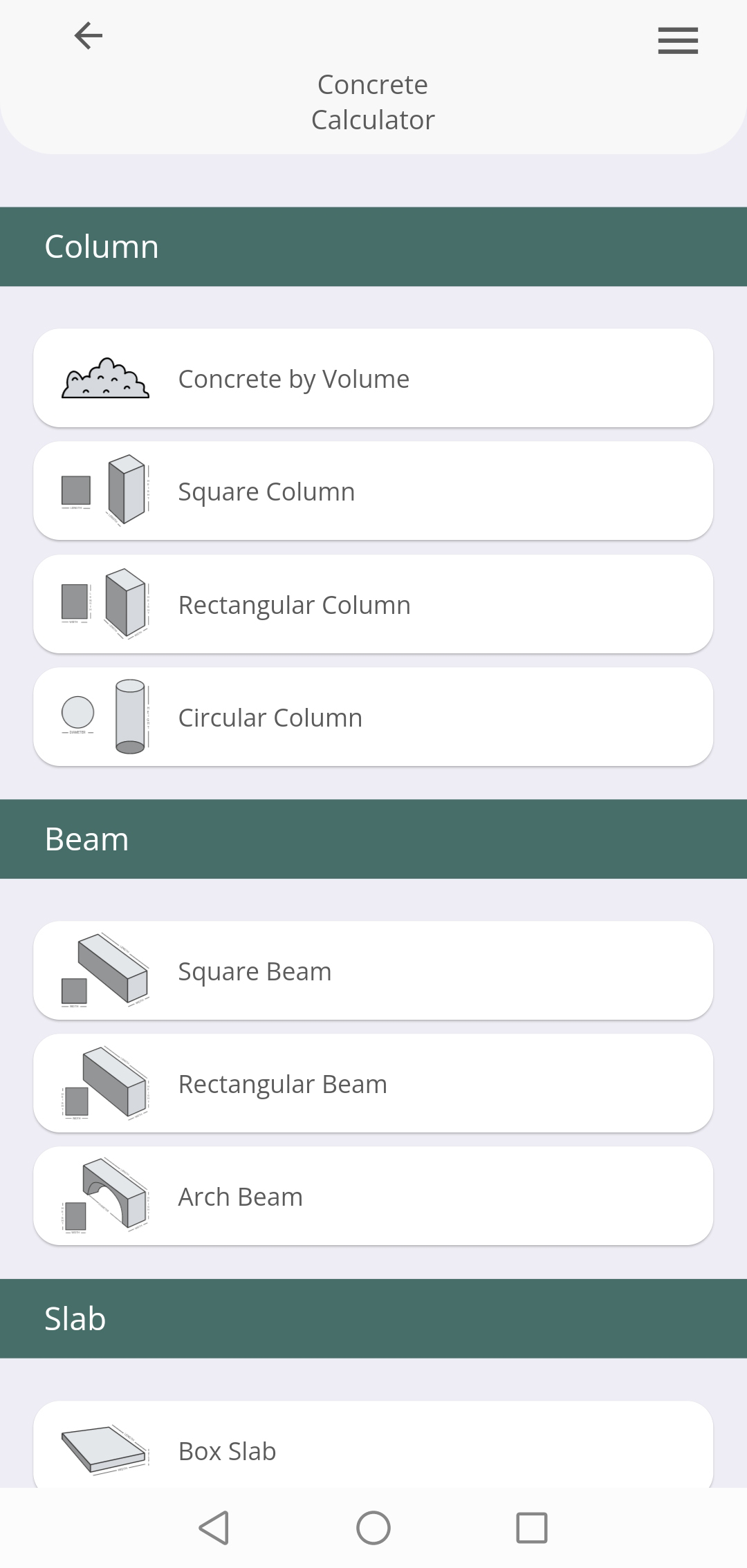 Construction Calculator - это приложение для Android, которое упрощает процесс расчета различных величин в строительных проектах. В главном окне приложения представлен набор категорий, включая калькулятор строительства домов, калькулятор строительства дорог, калькулятор строительства мостов, расширенная таблица BOQ, конвертер единиц измерения, калькулятор площади и объема.