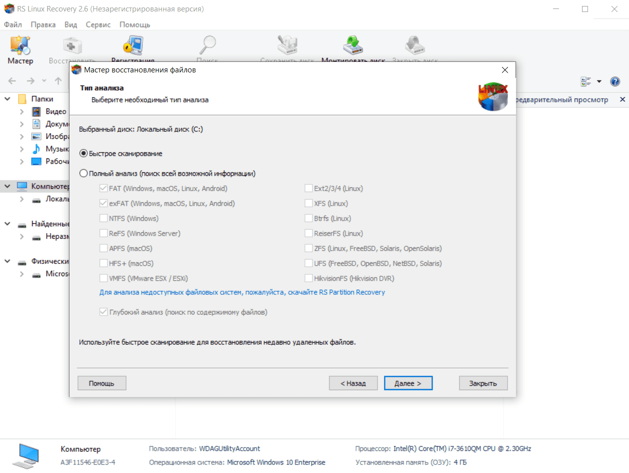 - Выбор типа анализа: RS Linux Recovery предлагает два варианта анализа - быстрое сканирование и полный анализ. Вы сами выбираете, какой метод использовать, в зависимости от ваших потребностей.