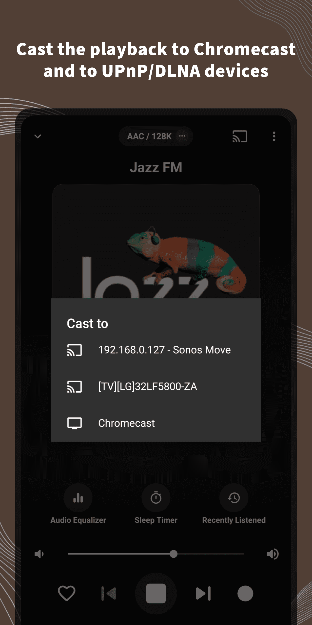 - Транслируйте радио на устройства Chromecast, UPnP/DLNA и VRadio для Windows, чтобы делиться музыкой с друзьями и семьей.