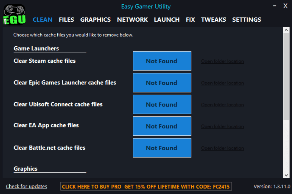 - Поддержка популярных игровых платформ: Easy Gamer Utility поддерживает множество игровых платформ, включая Steam, Epic Games Launcher, Ubisoft Connect, EA App, Battle.Net, и другие, а также графические технологии NVIDIA DirectX, OpenGL, AMD Shader и Intel Shader.