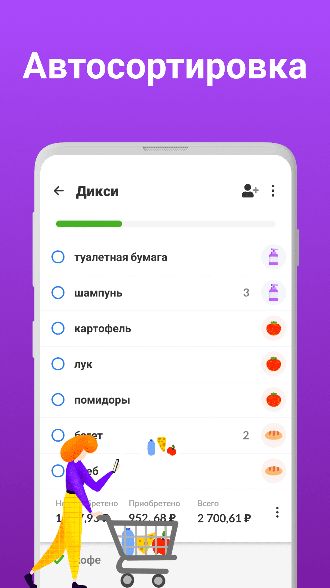 - Сортировка продуктов: Продукты в списках сортируются по секциям, упрощая поиск в магазине.