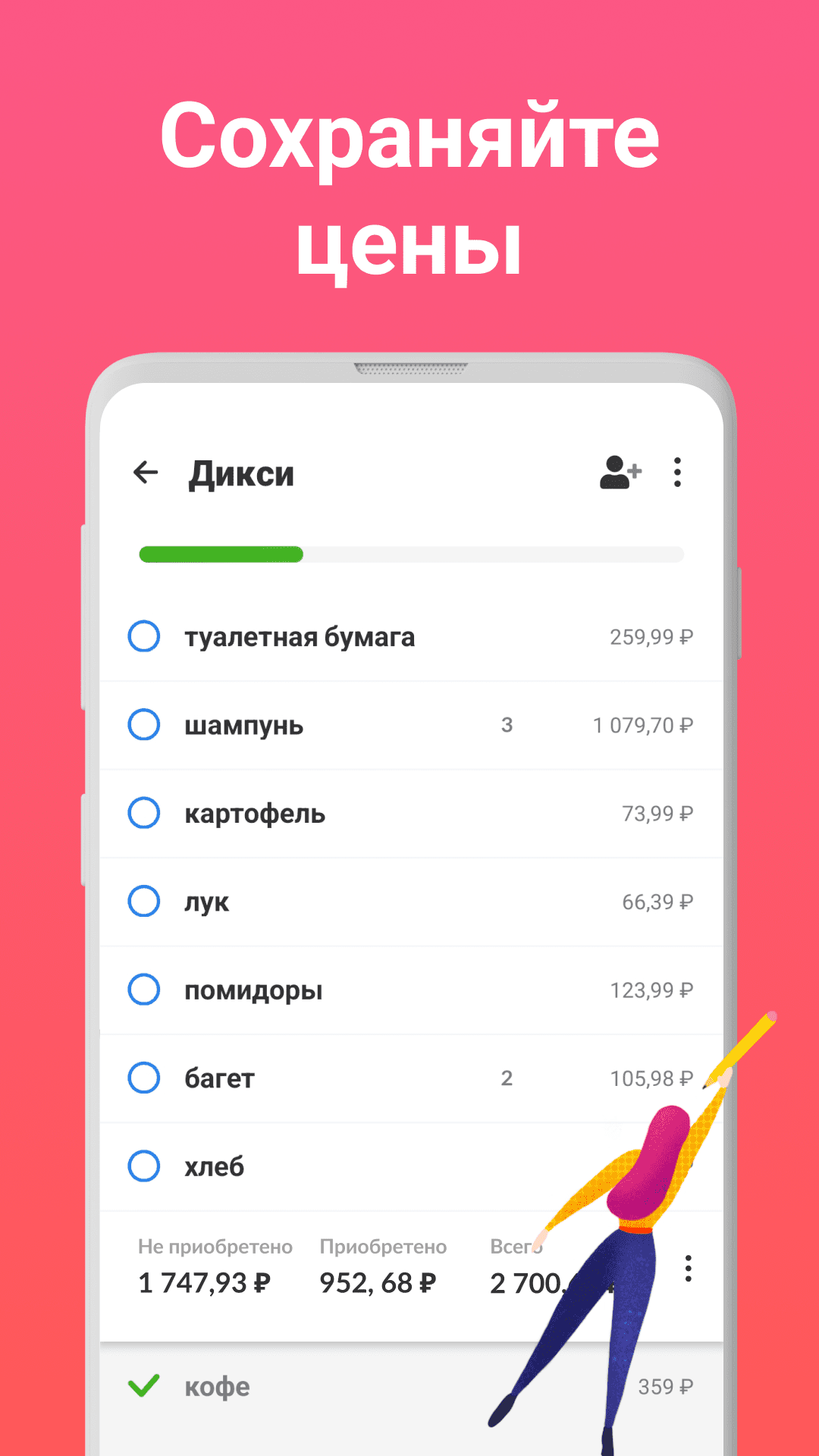 С Listonic вы можете легко создавать и управлять списками покупок, сделав их доступными для ваших знакомых. Добавляйте цены и количество к продуктам, а все изменения моментально синхронизируются на наших серверах. Таким образом, у вас всегда есть доступ к актуальным спискам, независимо от устройства.