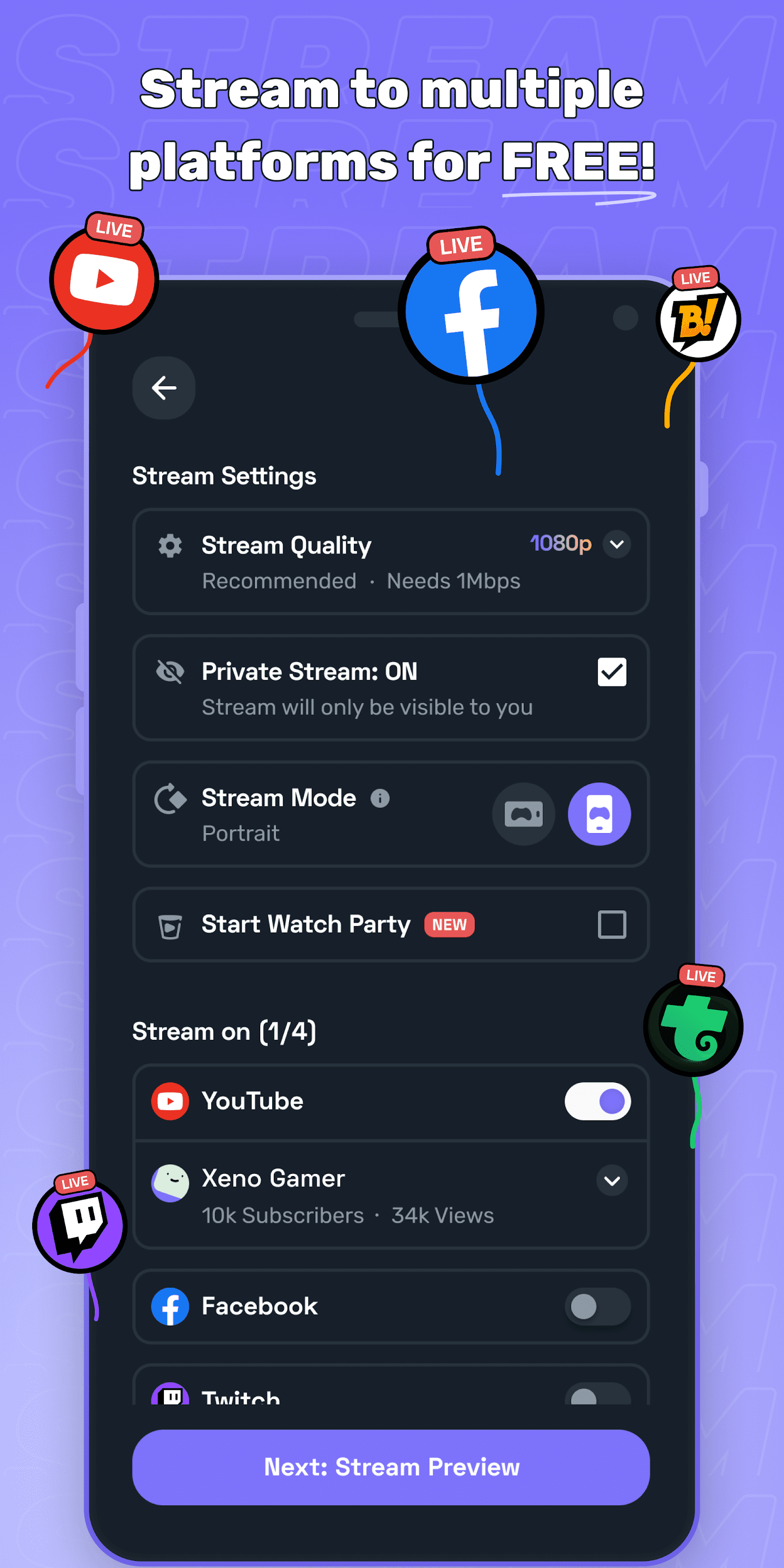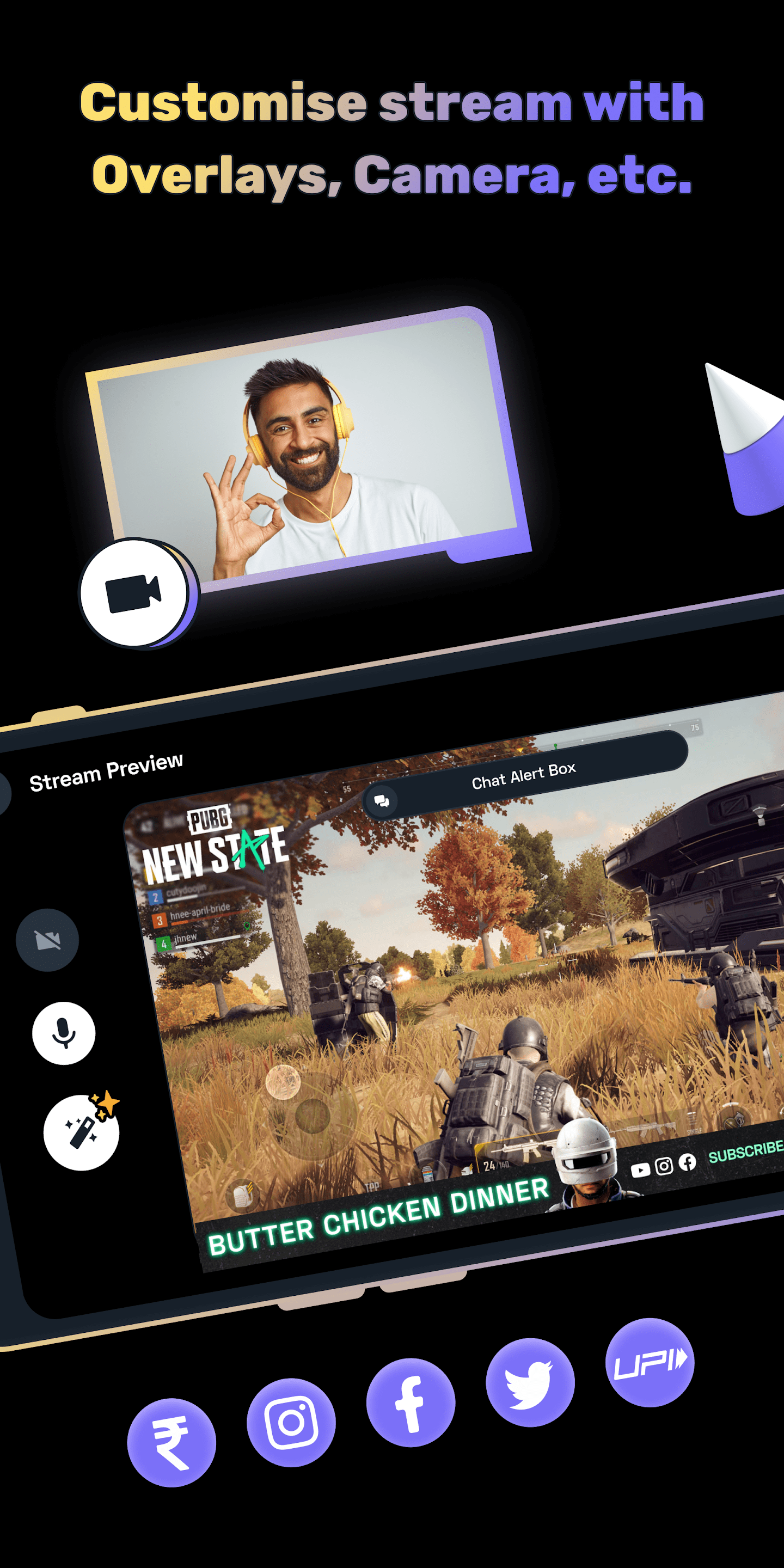 - Добавляйте лицевую камеру, настраиваемые миниатюры и настраиваемые анимированные наложения для профессиональных трансляций.