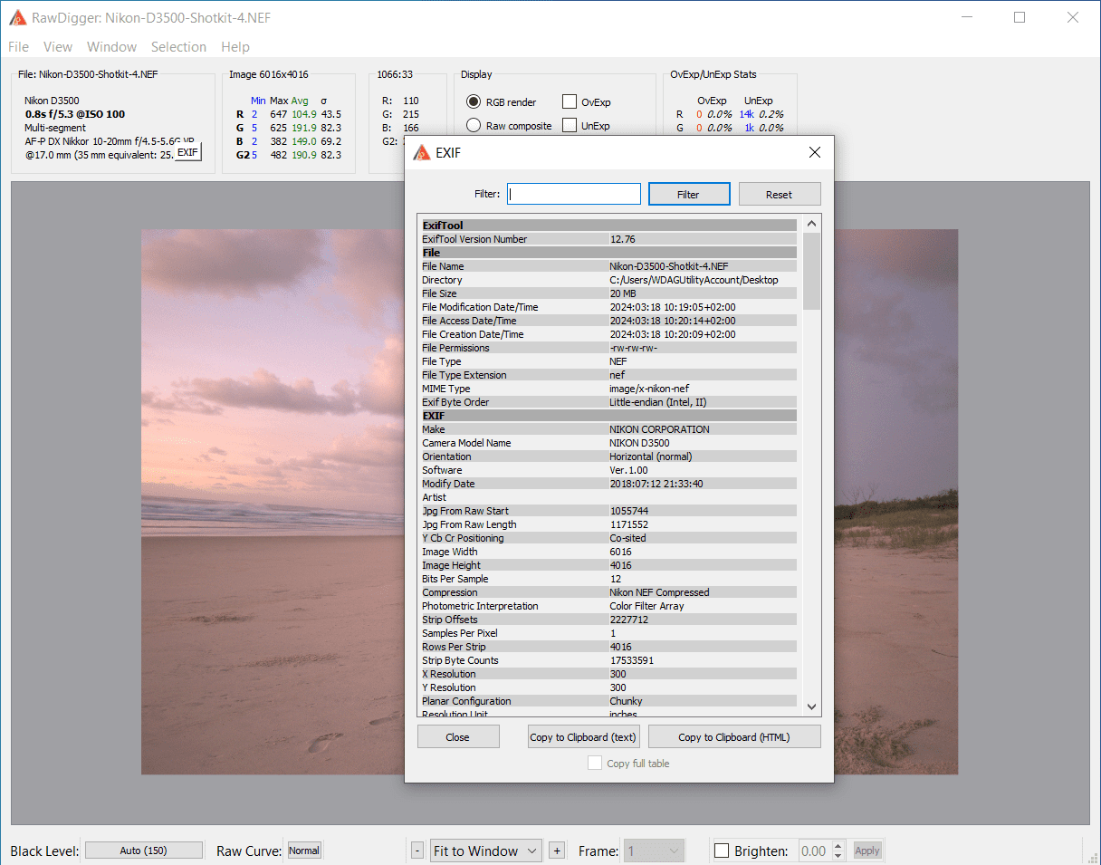 После загрузки изображения можно просмотреть такую информацию, как камера, на которую оно было сделано, дата, время, статистика пере- и недоэкспонирования. Его гистограмма может быть сгенерирована и отображена в новом окне, а также сохранена на жестком диске в виде файла CSV, TXT, PNG или JPG.