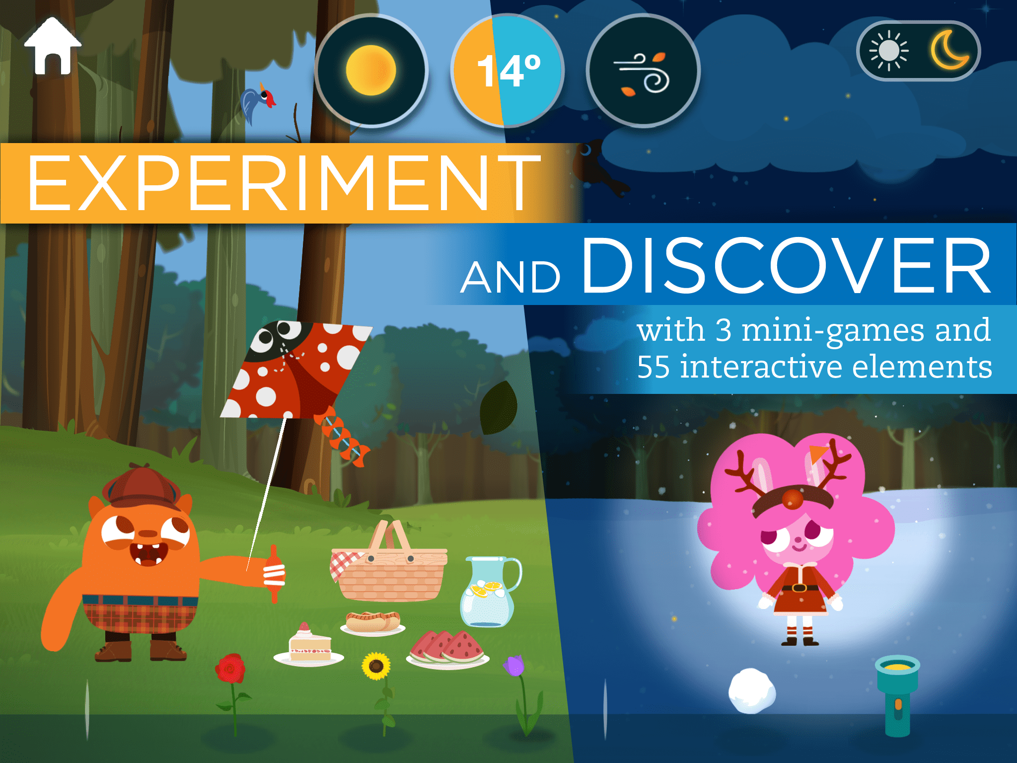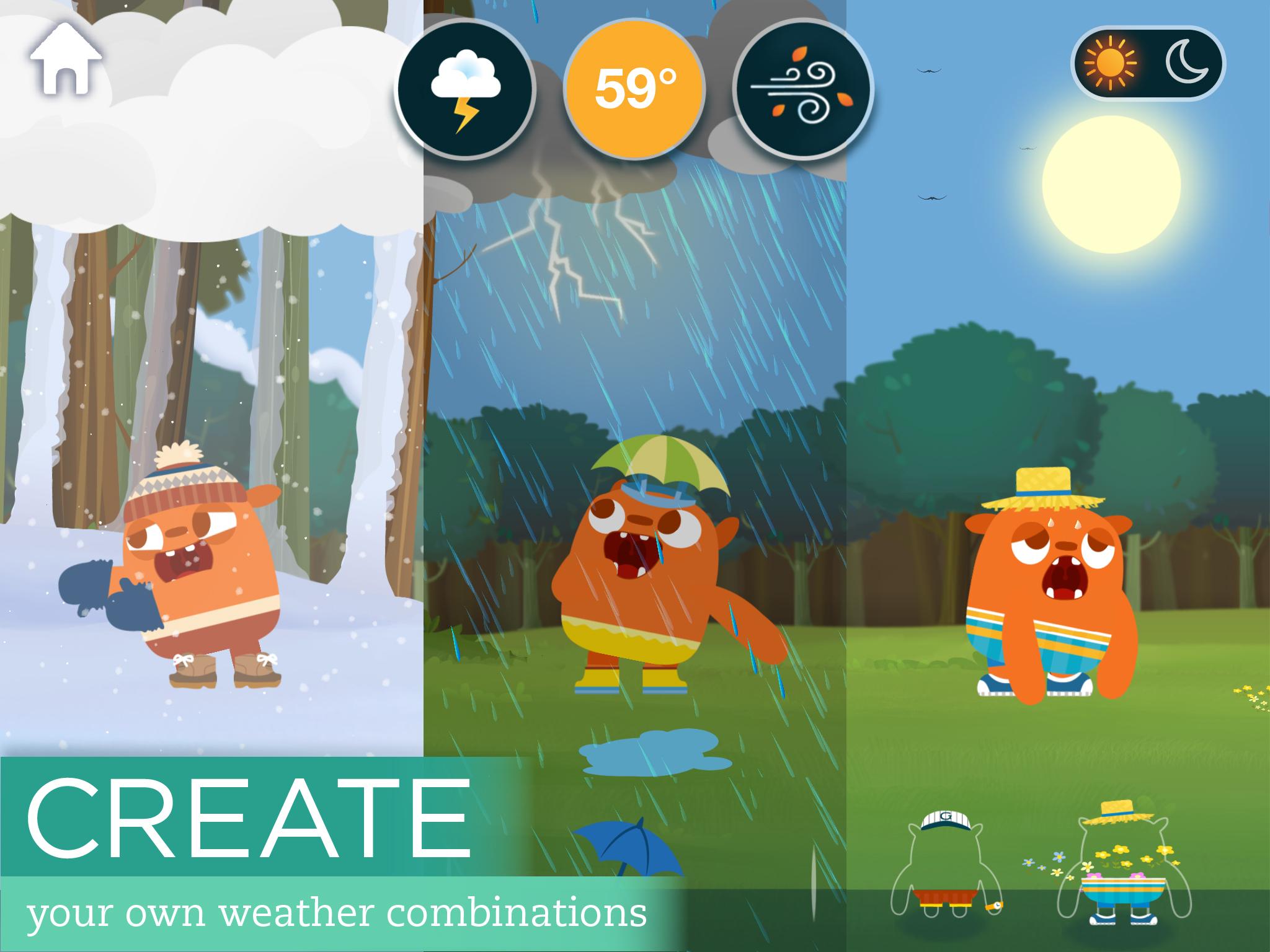 - Исследуйте 9 различных типов погоды: солнечную, облачную, дождливую, грозовую, снежную и другие.