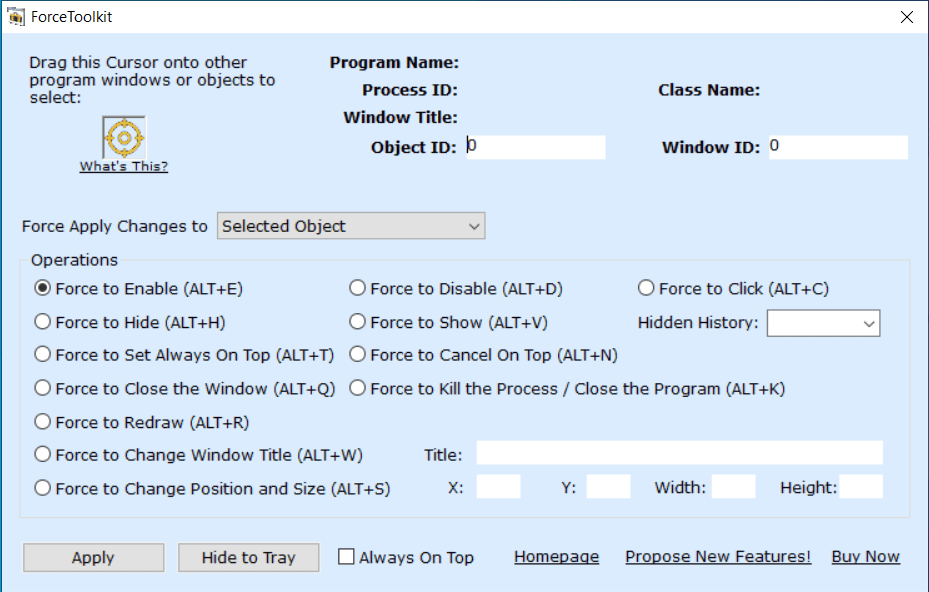 ForceToolkit — это приложение для управления окнами в операционной системе Windows, предоставляющее дополнительные возможности для настройки и управления элементами программ. Программа позволяет пользователю более тщательно управлять окнами приложений, предоставляя функции, которых нет в стандартной комплектации Windows. Это приложение полезно для тех, кто хочет получить больший контроль над окнами своих программ, предлагая возможности, которые помогут настроить рабочее пространство под индивидуальные нужды.