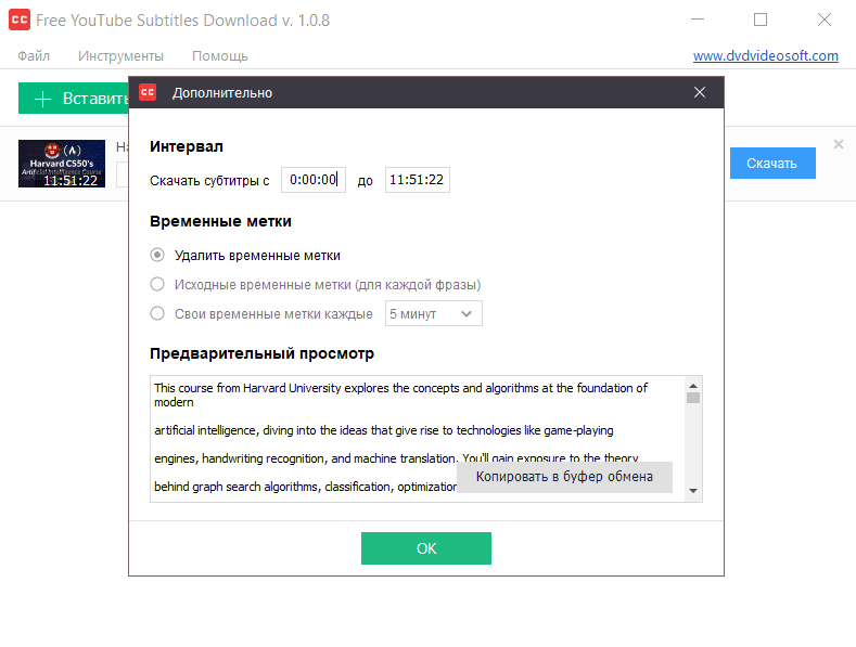 - Возможность извлечения субтитров из всего текста или из определенного интервала.