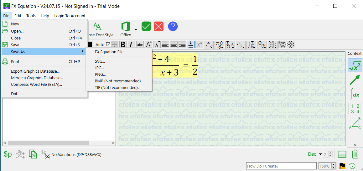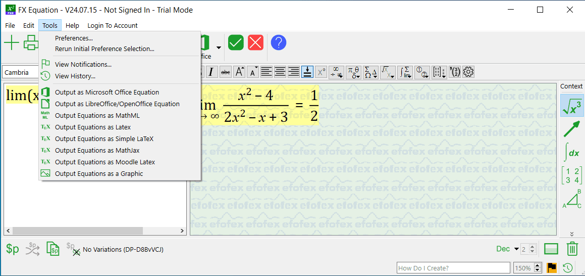 FX Equation - это программное обеспечение для создания, редактирования и форматирования математических уравнений, ориентированное на гибкость и эффективность. Приложение позволяет пользователям легко создавать математические уравнения, оформлять их соответствующим образом и решать с помощью множества специализированных функций. Основное внимание уделено простоте использования и высокой степени настройки, что делает FX Equation идеальным инструментом для преподавателей, студентов и всех, кто регулярно работает с математическими выражениями.