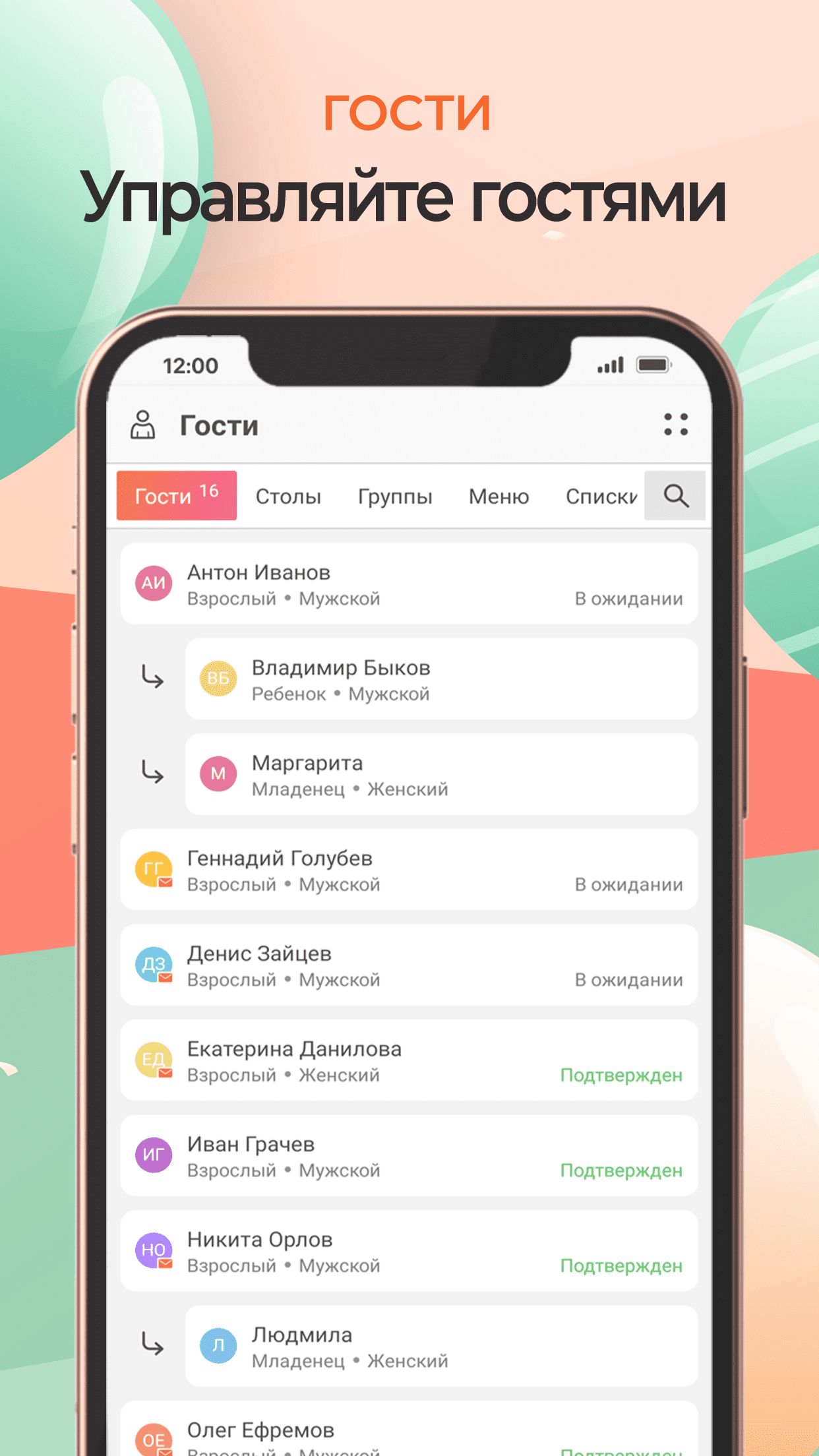 - Ведение списка гостей: Формируйте списки гостей, распределяйте их по группам и столам, планируйте меню. Анализируйте информацию о гостях: пол, возраст, статус приглашения.