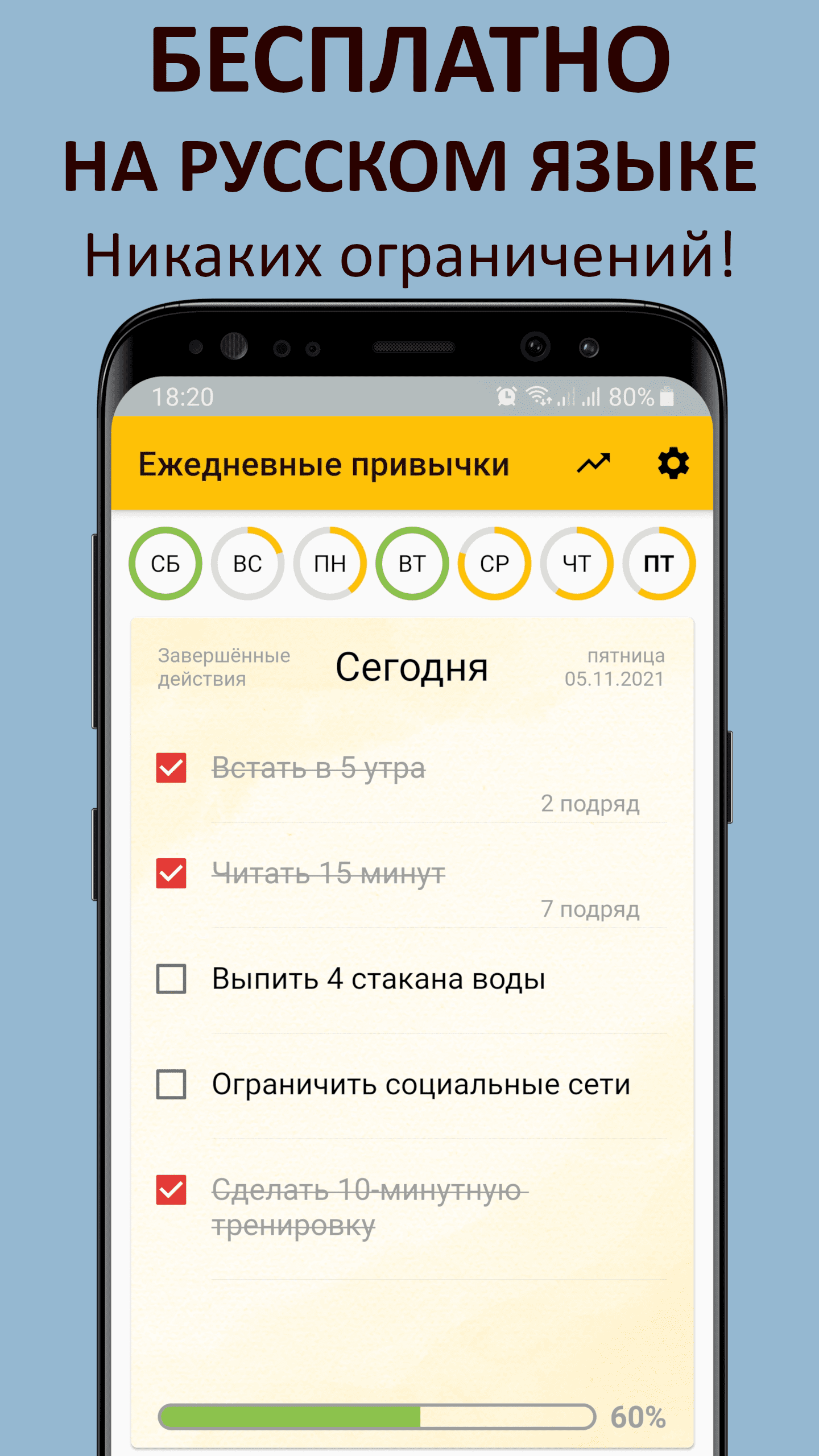 - Отслеживание прогресса с системой рейтингов и наград за регулярное выполнение.