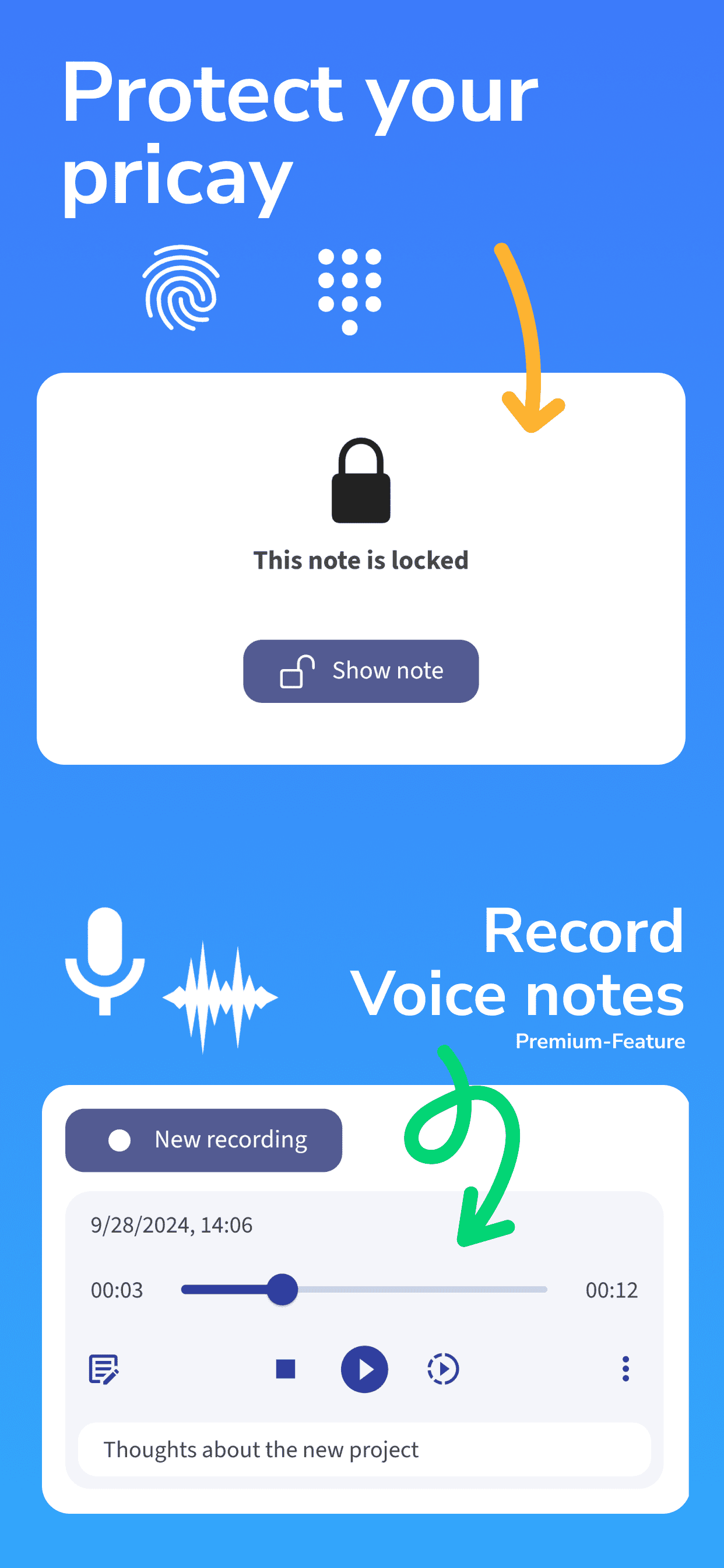 - Возможность блокировки приложения и заметок с помощью PIN-кода.
