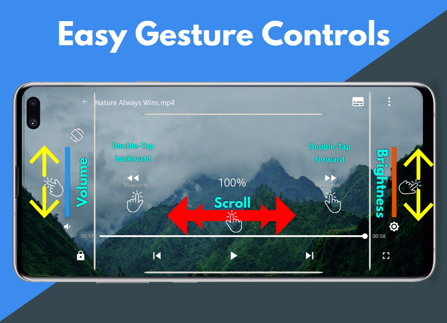 - Управление с помощью жестов для регулировки громкости, яркости и навигации по видео
