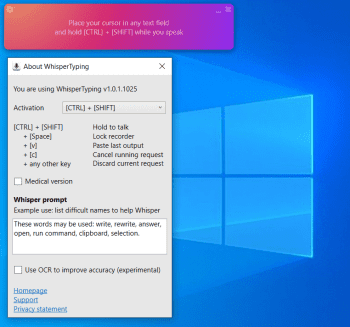 Одной из особенностей WhisperTyping является удобство управления. Пользователь может активировать запись нажатием кнопки или удерживанием сочетания клавиш CTRL+Shift для активации режима push-to-talk. После завершения записи приложение автоматически вставляет текст в выбранное текстовое поле, что упрощает использование и делает его доступным для работы с любыми текстовыми редакторами.