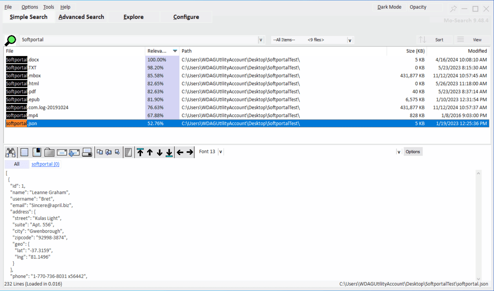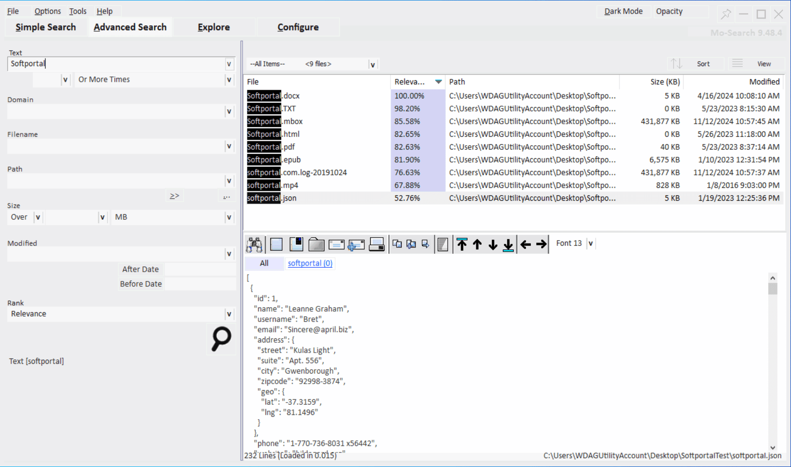 Mo-Search оснащен гибкими фильтрами, с помощью которых пользователи могут сортировать найденные файлы по разным критериям, включая название, расположение, размер, релевантность и дату последнего изменения. Программа поддерживает специальные символы подстановки, что позволяет делать запросы более точными и охватывающими широкий спектр данных.