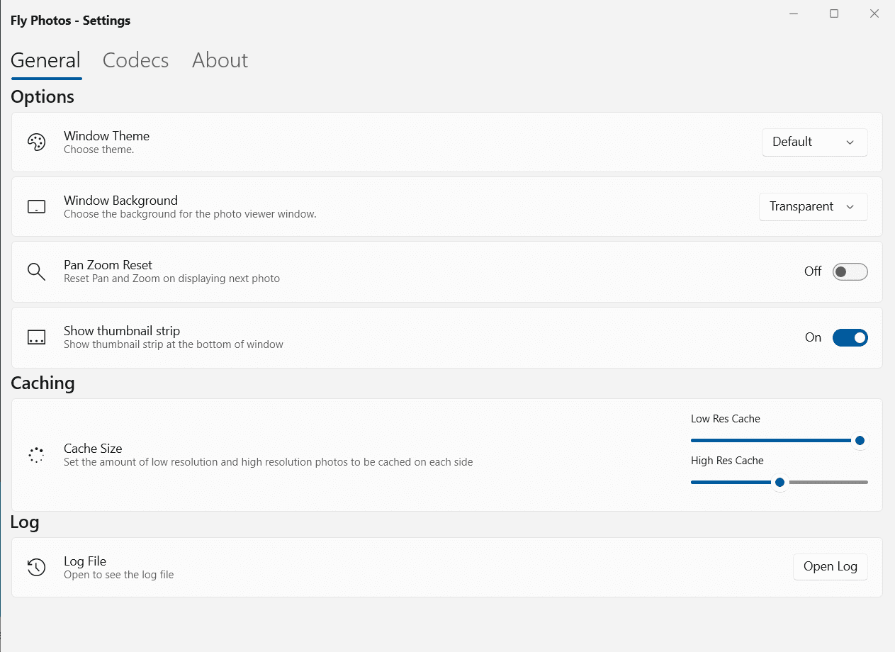 Интерфейс приложения разработан в соответствии с языком дизайна Microsoft Fluent Design, благодаря чему приложение органично вписывается в стиль Windows 11. Fly Photos поддерживает визуальные эффекты Mica, Acrylic и Frozen, а также предлагает светлую тему, улучшающую видимость элементов управления.